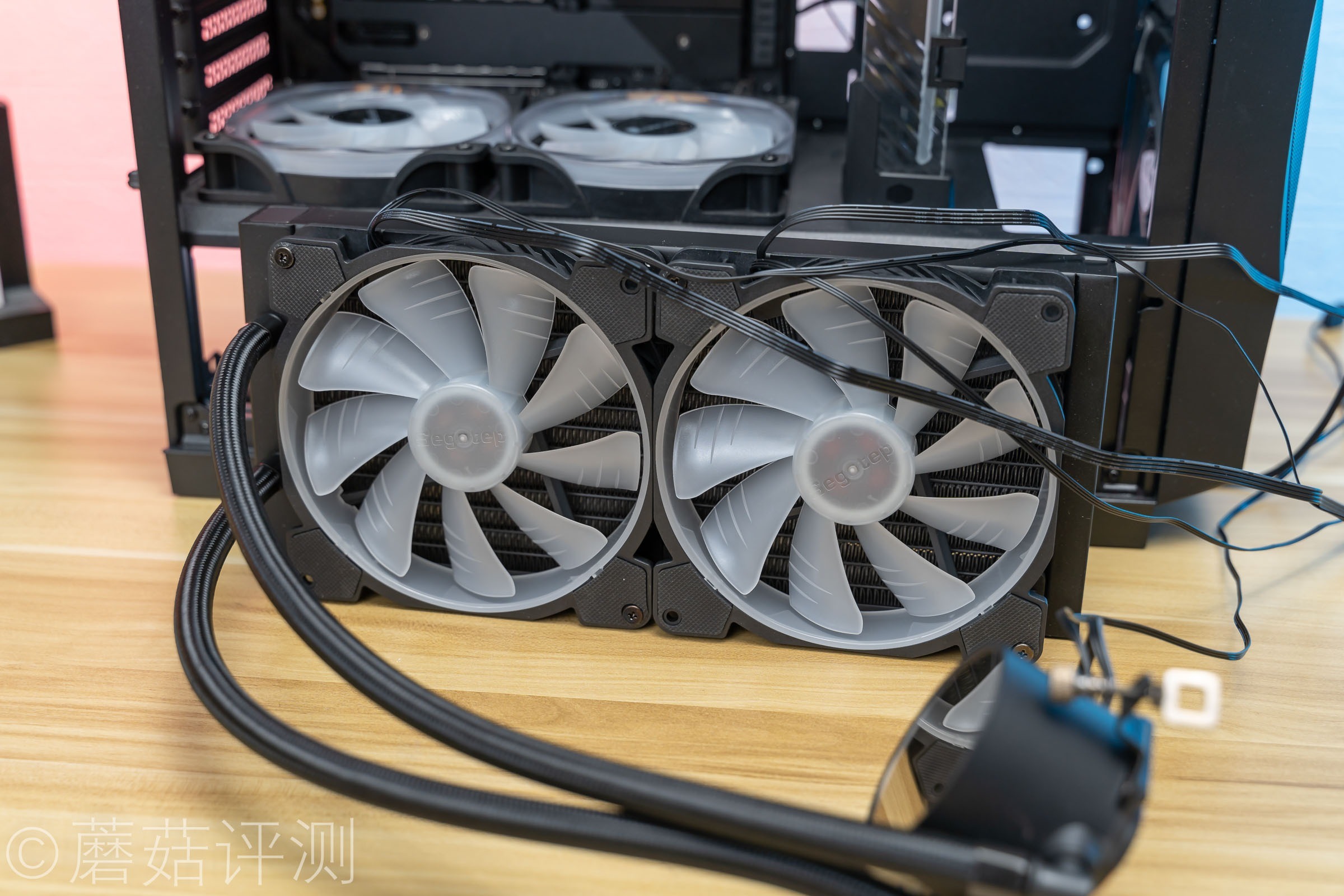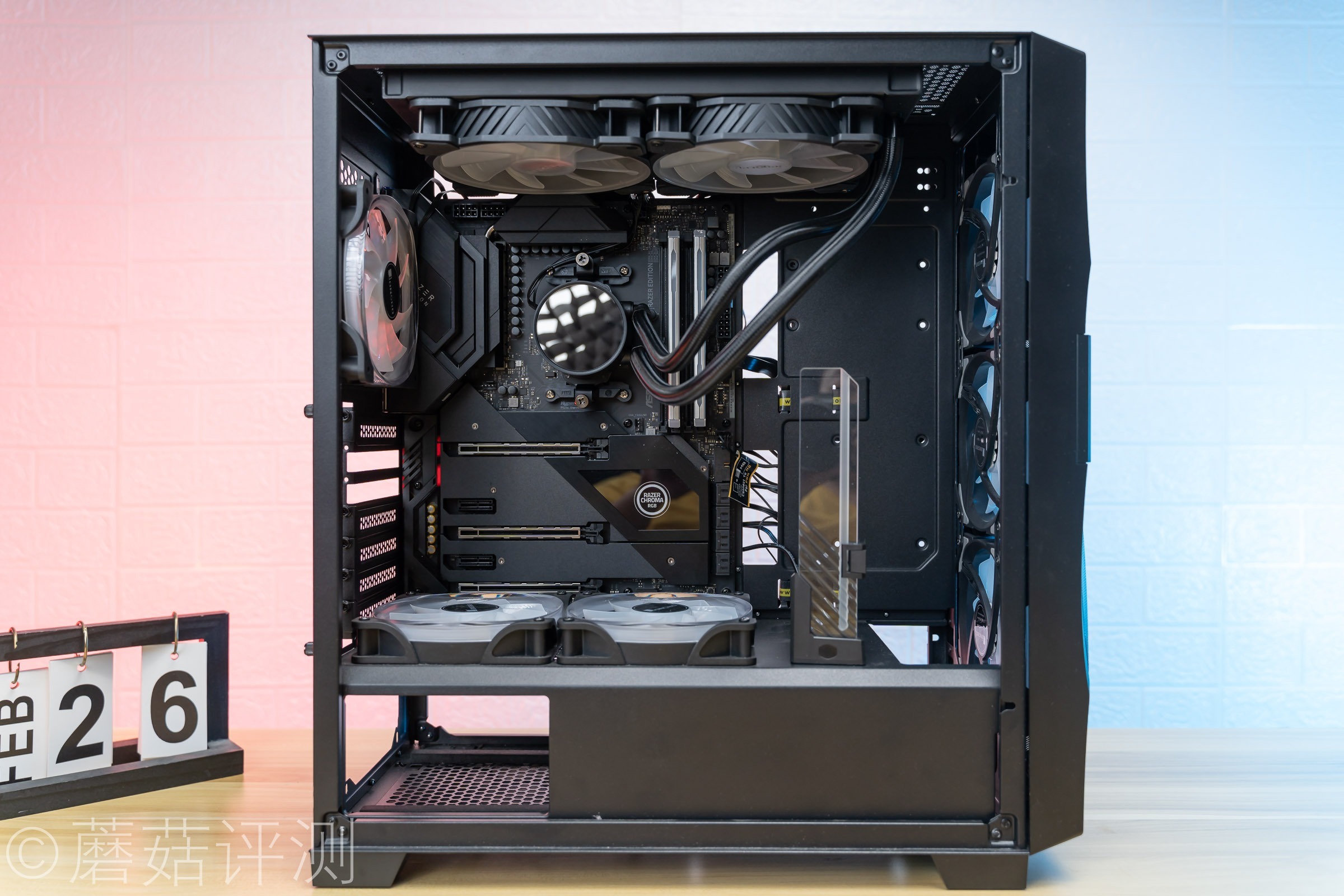 ▼水冷排直接固定到机箱上面,机箱的整体空间还可以,顶部安装水冷排没啥问题。