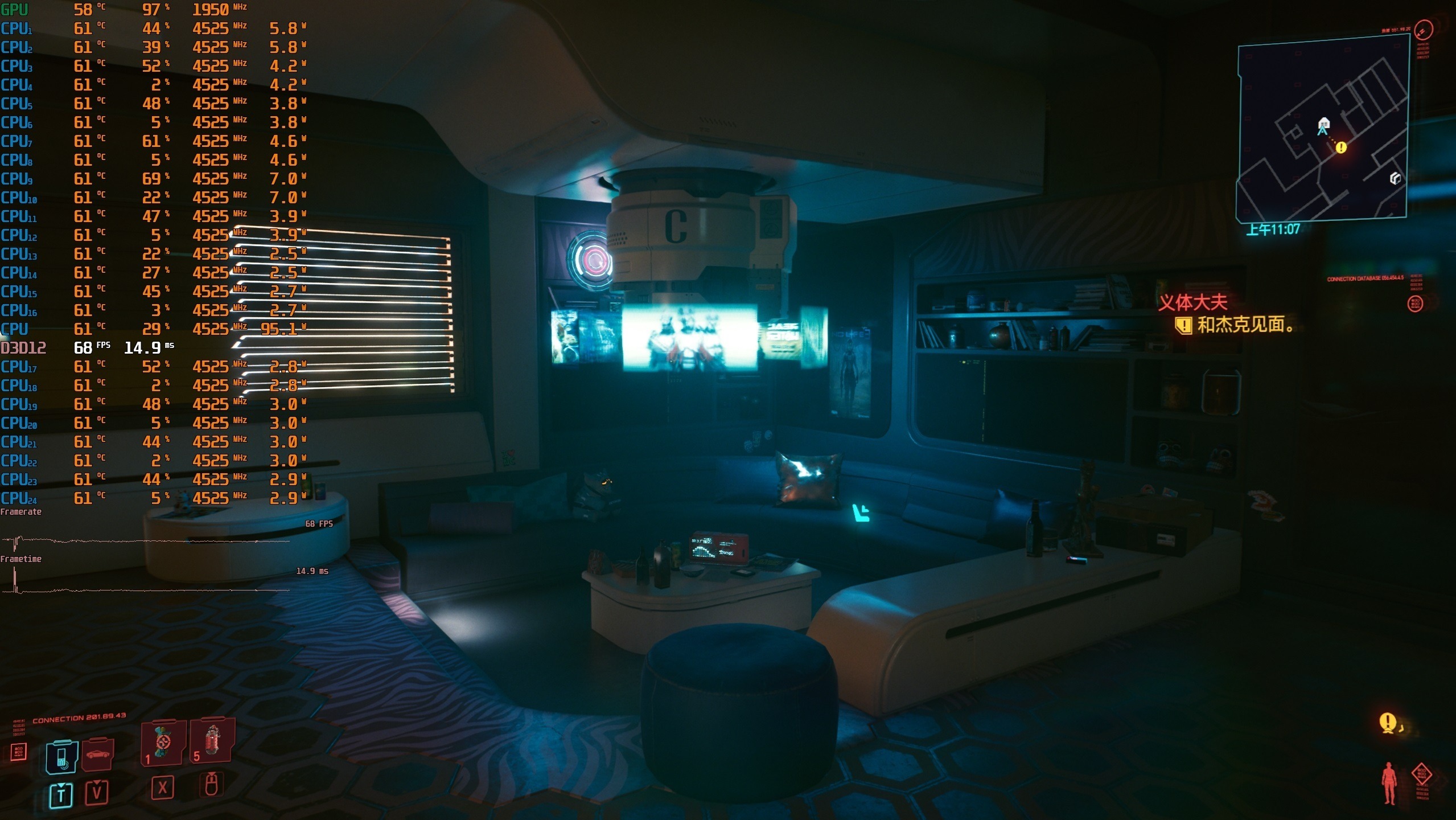 ▼室内小场景游戏帧数在68帧左右,很流畅。