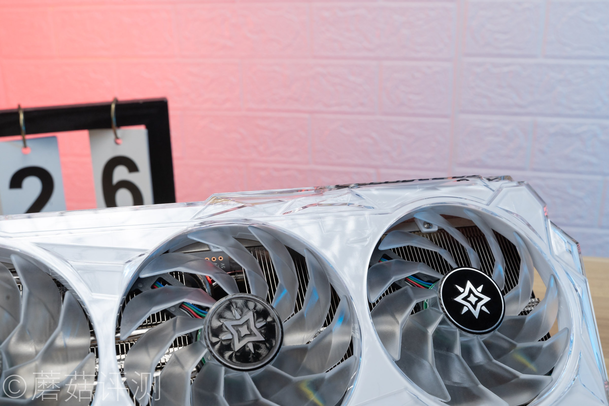 ▼显卡风扇罩外面还有一层透明的塑料,表面有特殊的切割设计,各种平面、棱线,看起来很不错。
