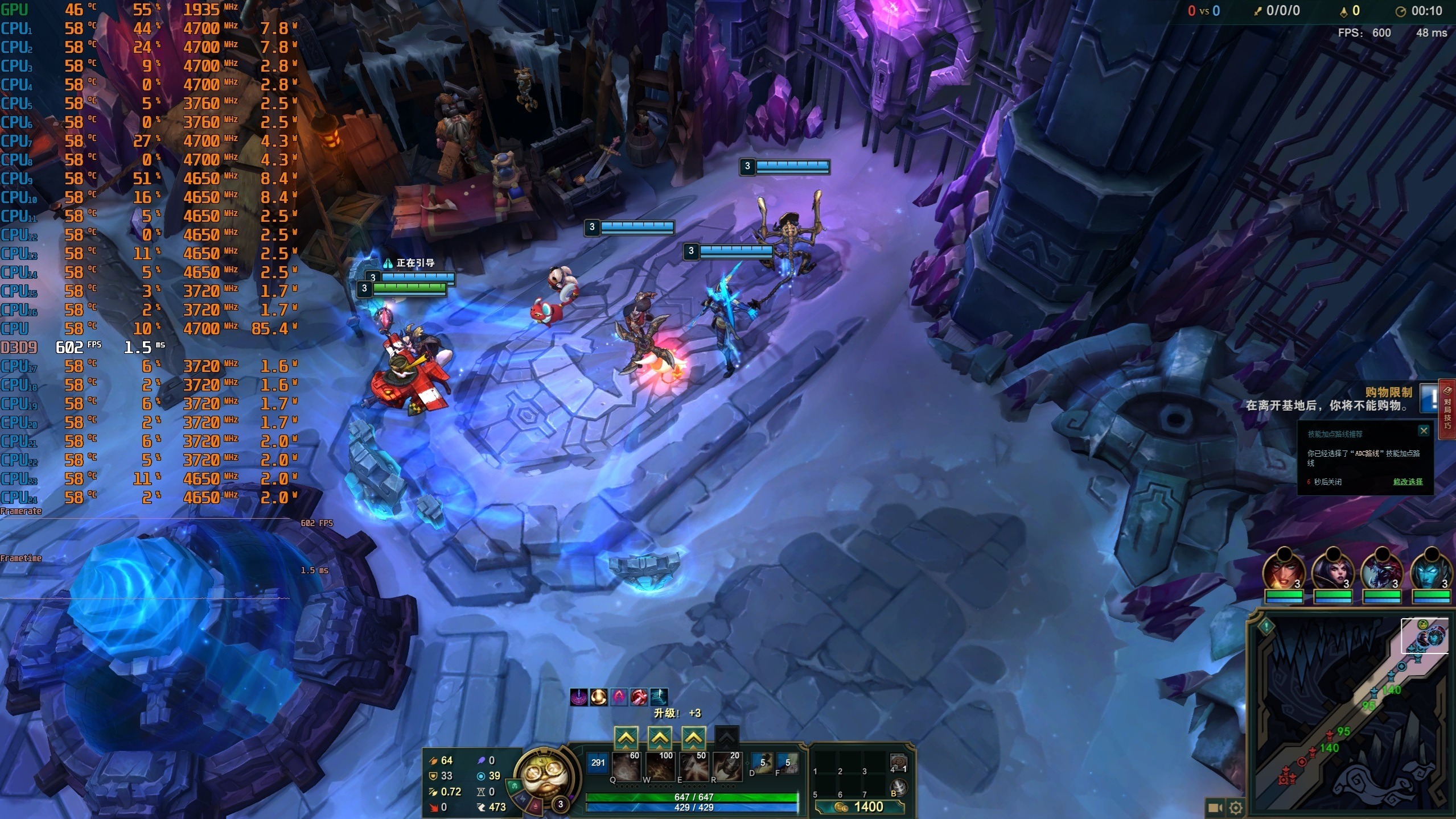 ▼游戏实测,LOL大乱斗模式,2K分辨率,全极高画质,泉水游戏帧数在602帧。