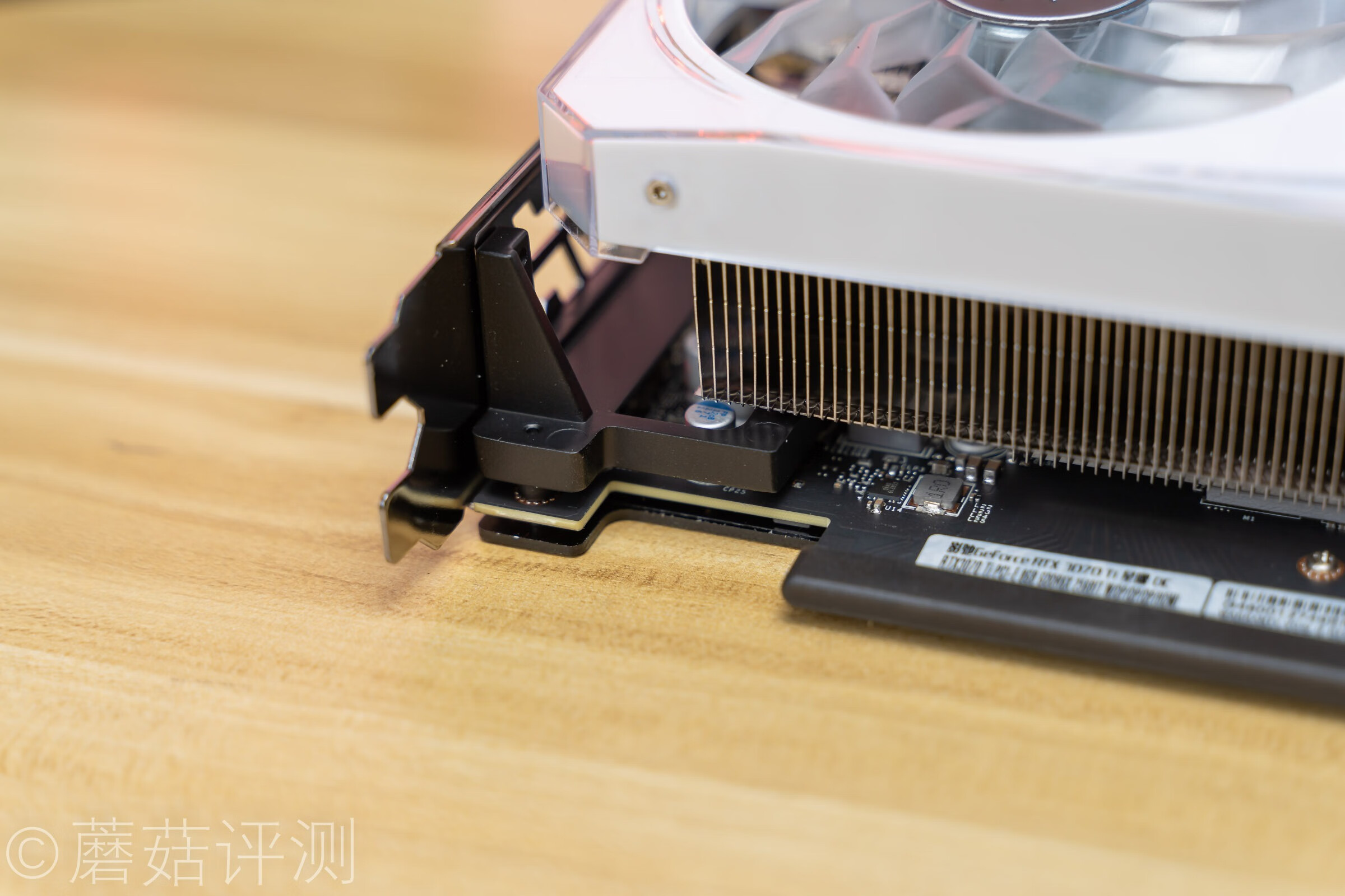 ▼靠近看看,在显卡靠近PCIe挡板的部分,可以看到黑色的金属加强件,辅助显卡受力。