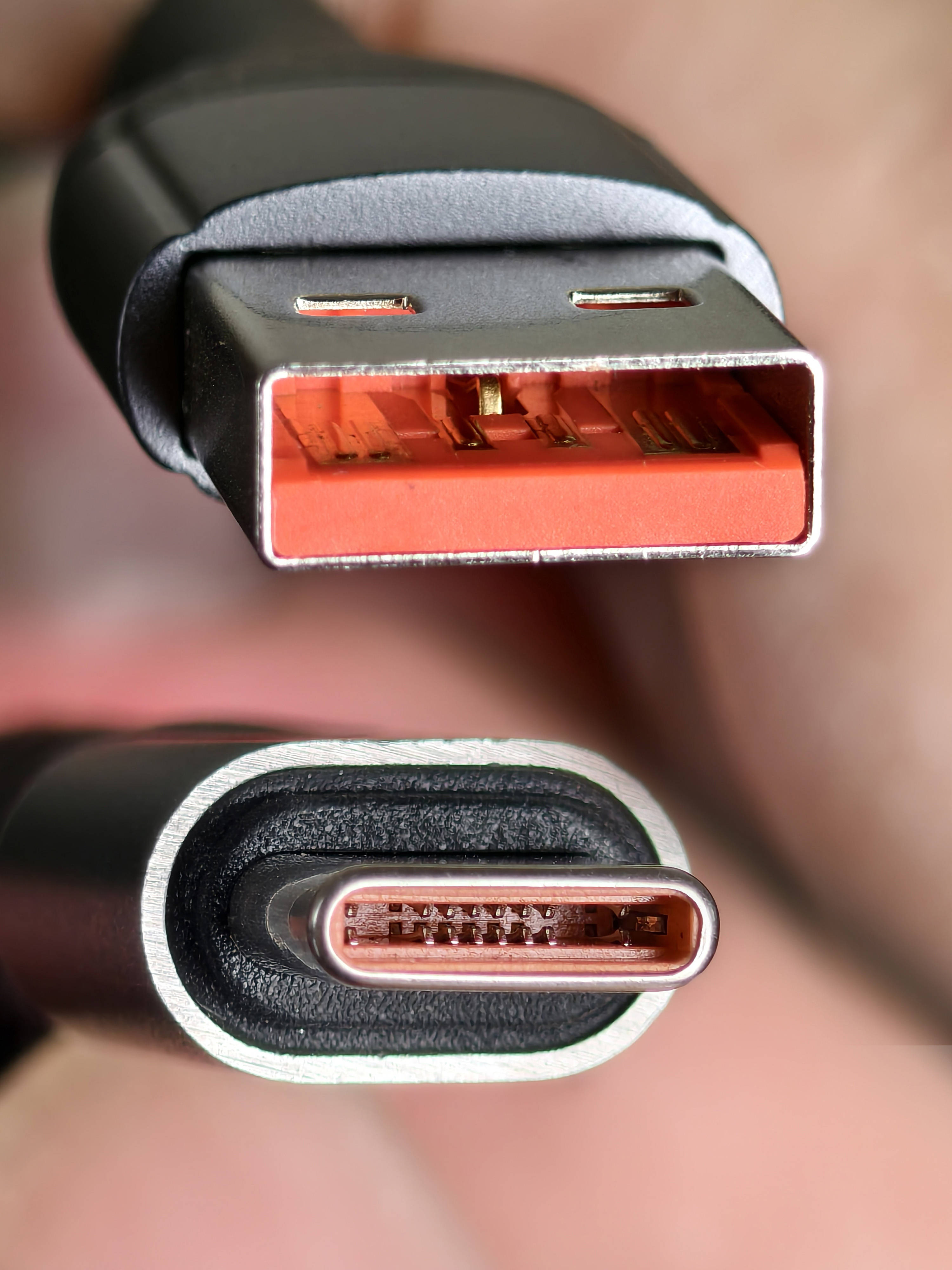 ▼可以看到A To C款的A口里,是和小米魔改线一样,里面有个用来兼容PD协议的触点,这就已经击败了大多数A To C快充线了,正负极还进行了加宽,以通过大电流;因为主要是充电用的,所以两款线的C口连接器里面都不是满针的