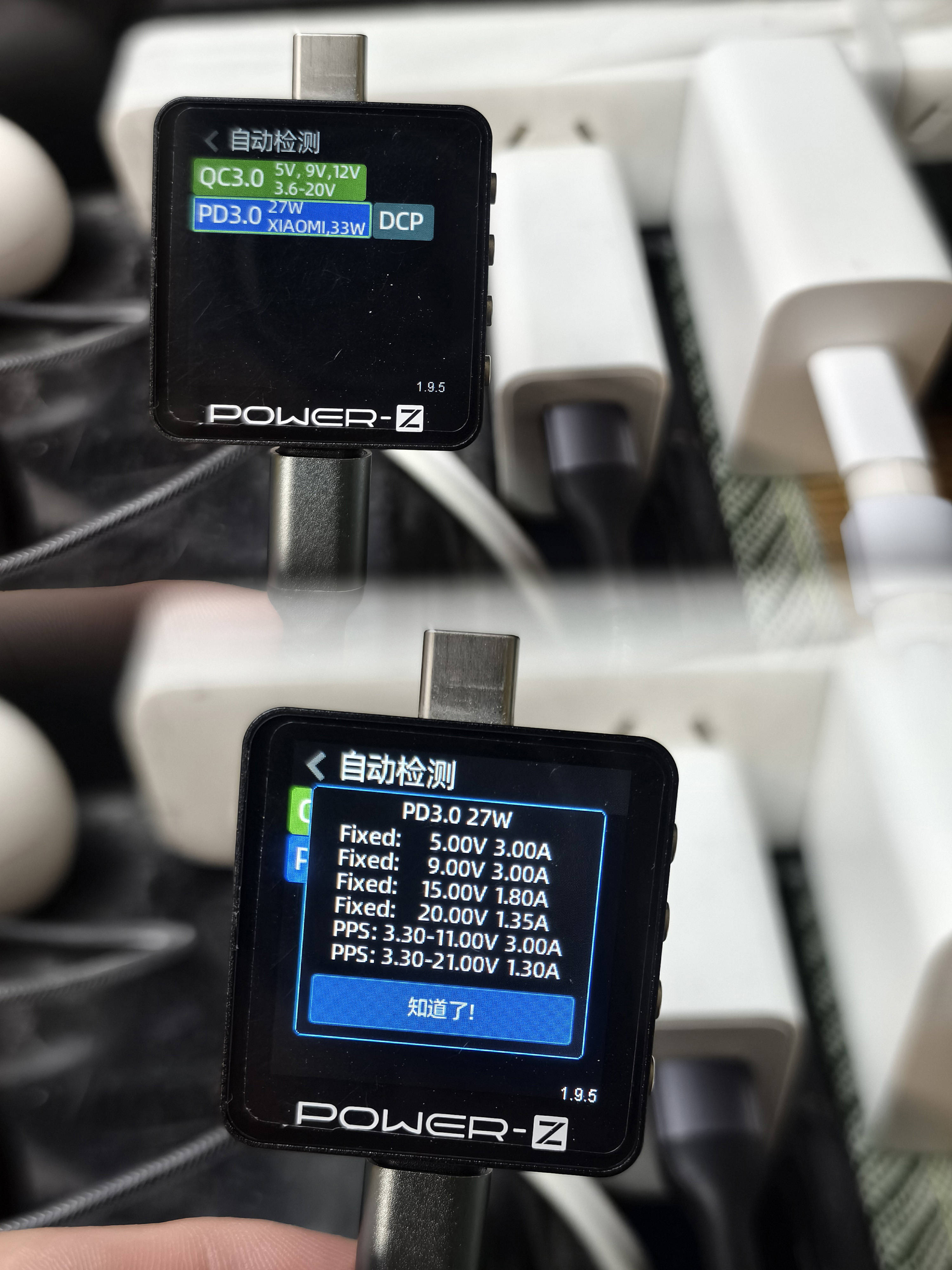 ▼先用一条普通的A To C充电线测一下小米33W充电头,可以看到直接测不出来小米私有协议