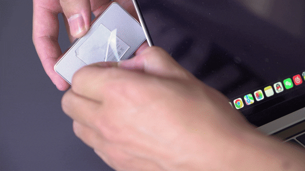 ▼正式安装之前,一定要先把硬盘和电脑连接上,然后开合盖子看一下位置,确保数据线的姿态是自然的。确认没问题后,记住大概位置,然后把硬盘背后的胶膜撕掉,插上数据线,最后往Macbook的A面一贴,就大功告成了