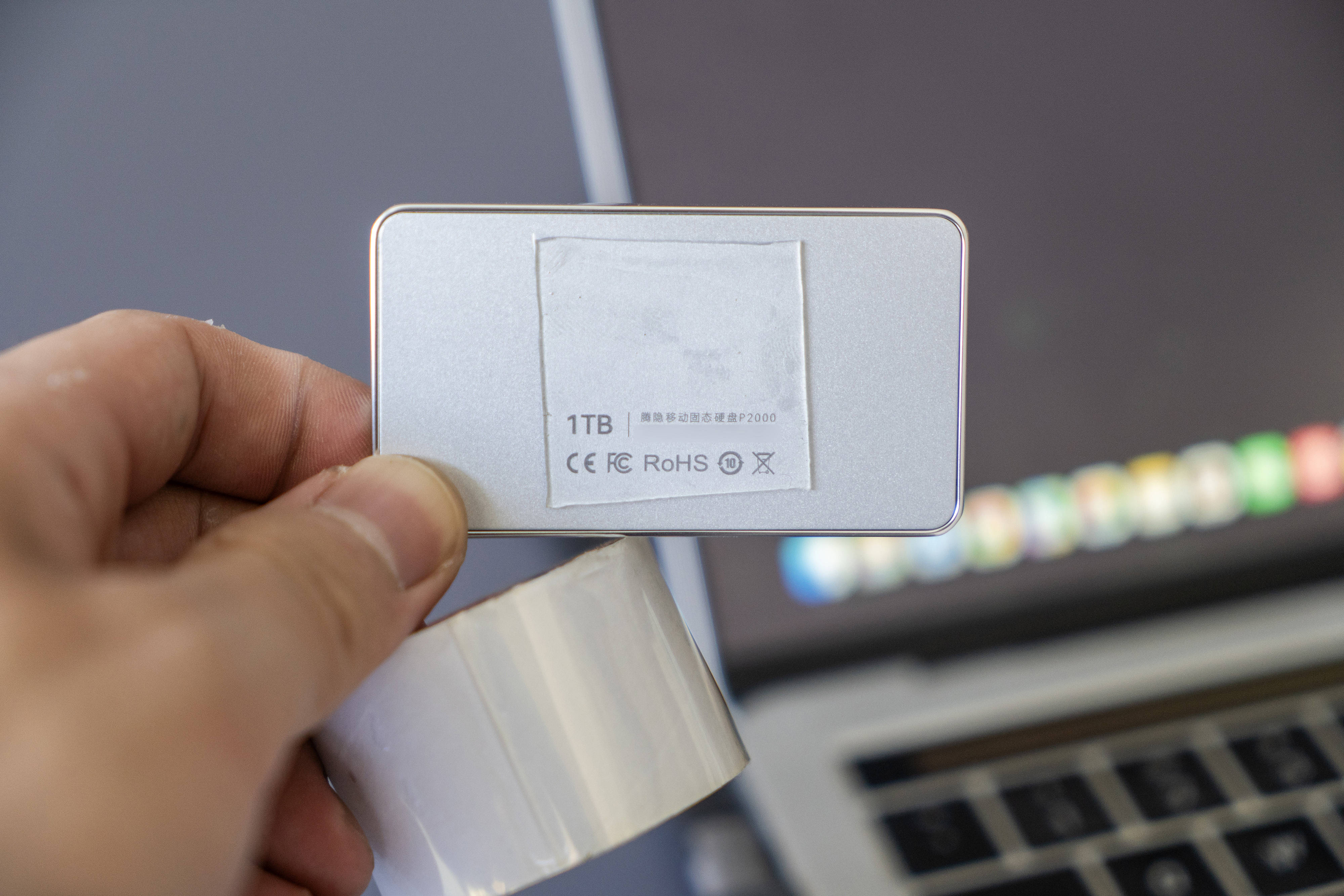 ▼目前市面上有很多为外挂“尿袋”方案开发的胶粘固定配件,普通的胶为了牢固,粘上去就很难撕下来,或撕下后胶痕去不掉。所以我建议购买3M无痕胶,无痕胶不但固定牢固,还能够无损不留痕迹撕下来,并且是最便宜的方式,没有之一。剪一截无痕胶先粘在这款腾隐P2000背面,因为这款硬盘的外壳足够平整,所以无痕胶贴上后是很牢的,不去刻意拆它不会脱落