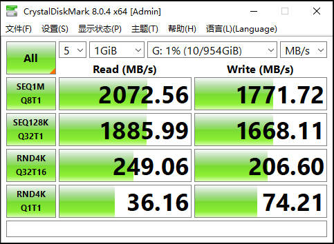 ▼因为苹果系统测试的软件太少了,我就切换到双系统Windows10上进行测试(这就是苹果安装双系统的方便之处)通过CrystalDiskMark测试结果可以看到,读取速度大约为2072MB/S,写入速度大约为1771MB/S,排除一些损耗、终端系统和配置性能影响,其实这个速度算是已经跑满了,完全符合这款硬盘的参数