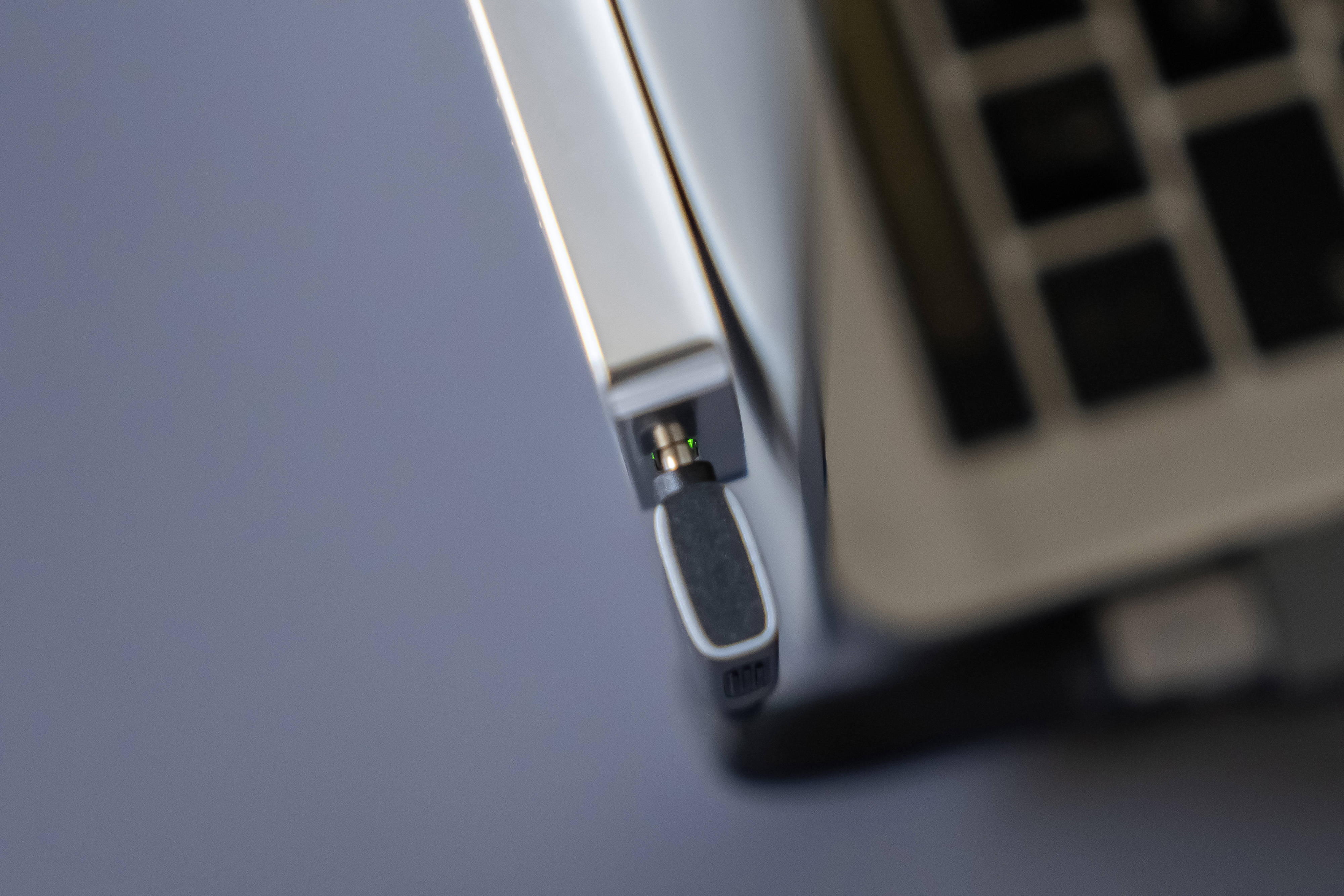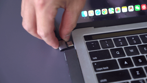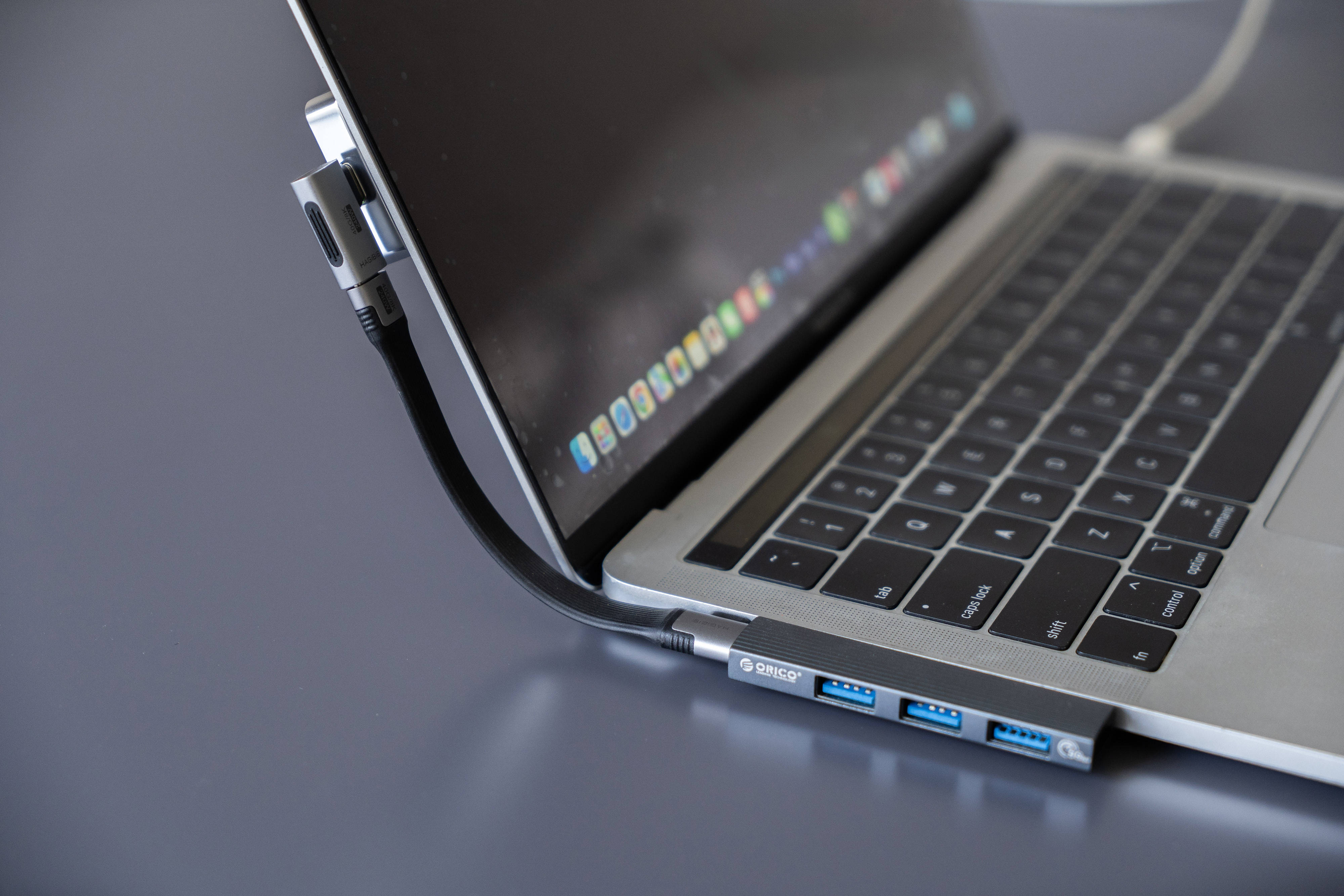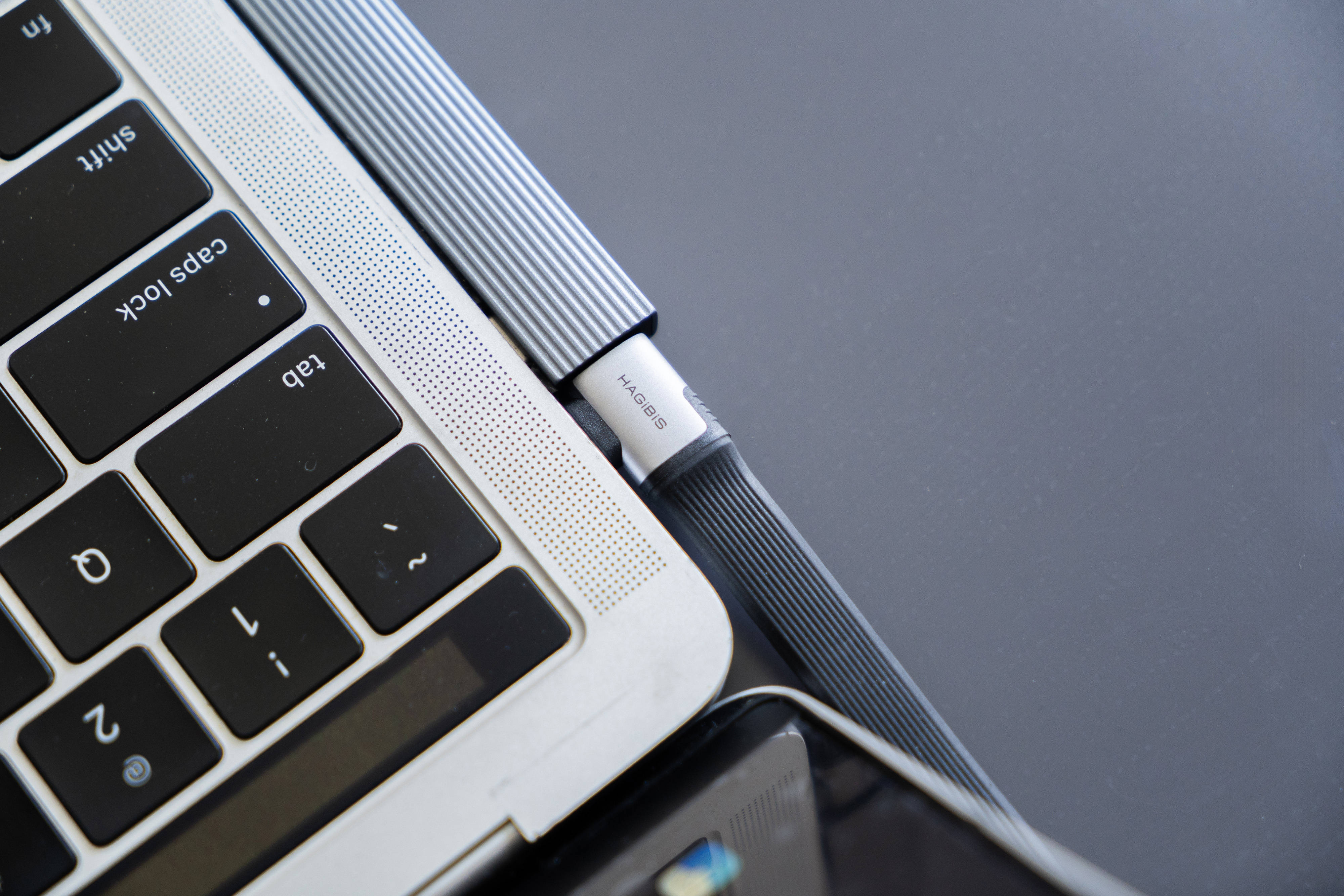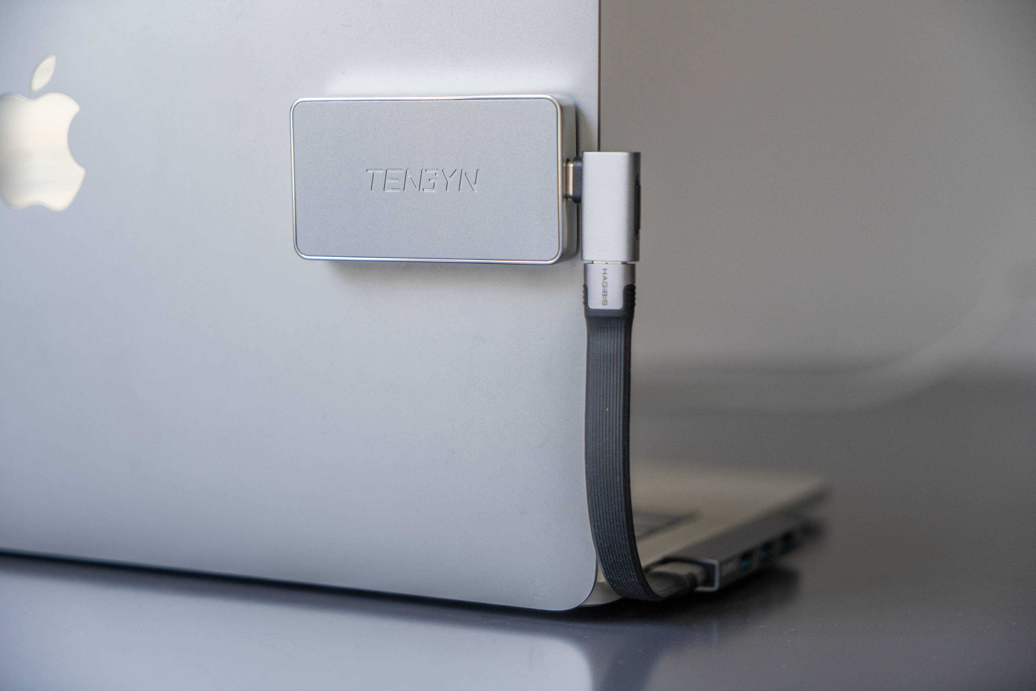 ▼连接线我用的是海备思240W40G全功能C To C扁数据线,这款线保证连接的线材不会出现瓶颈,但是40G这款只有单边弯头的款式,所以还需要搭配一个弯头转接头,建议直接购买双弯头的80G版本。将线插入Macbook的C口,我这台Macbook Pro左上角的C口是最合适的安装位置