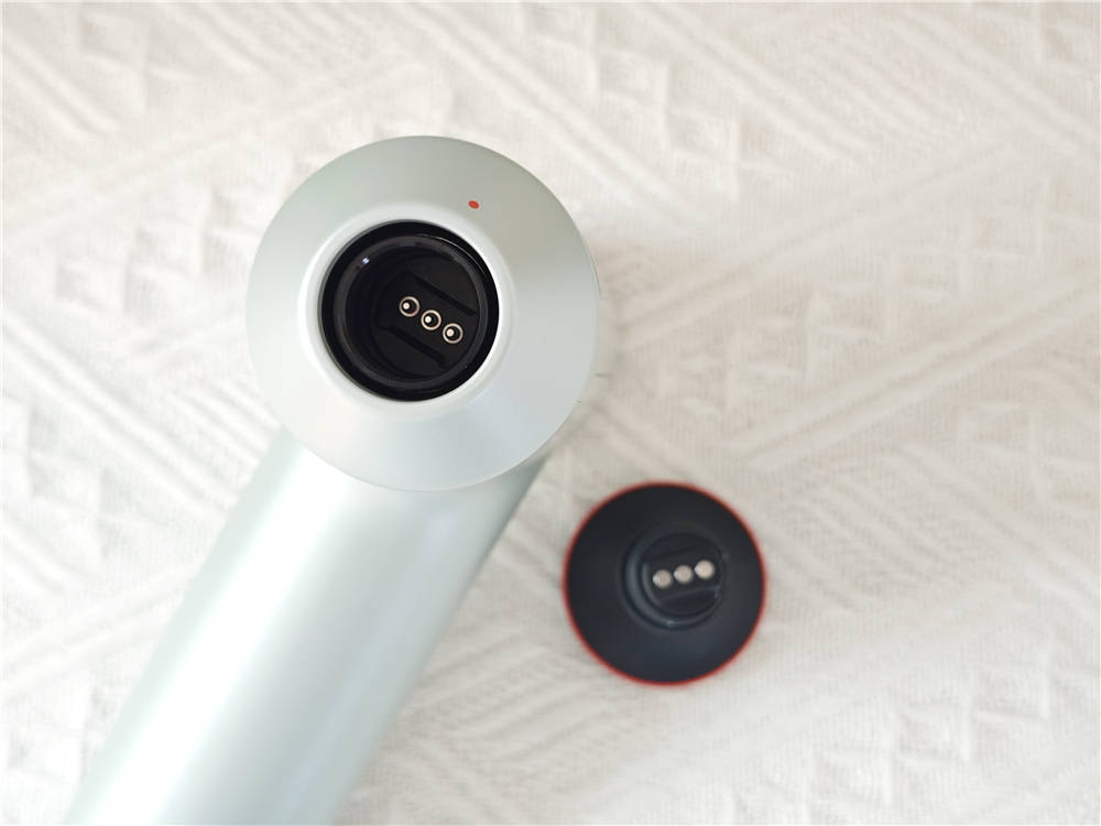 按摩头采用插拔旋转更换形式,用户可以根据自身使用场景更换不同按摩头,热敷平头具有发热功能,更换时要对应机身橙色标识对应插入。