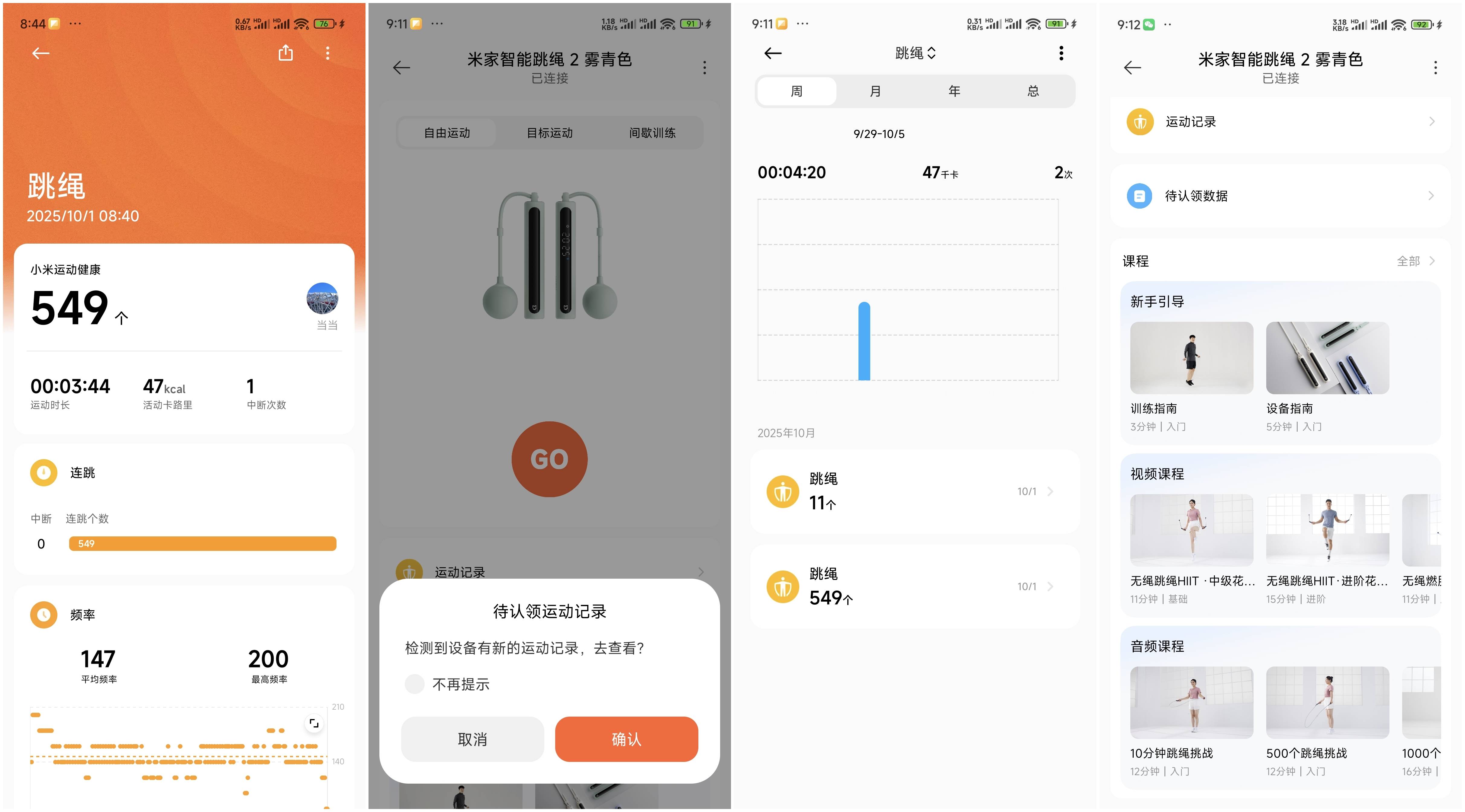 米家智能跳绳 2,有绳无绳双模式,室内场景采用空气甩球设计,室外场景可选择运动绳,绳长可根据自身身高调节,智能课程跟练,自定义训练模式,室内室外皆可畅快有氧。