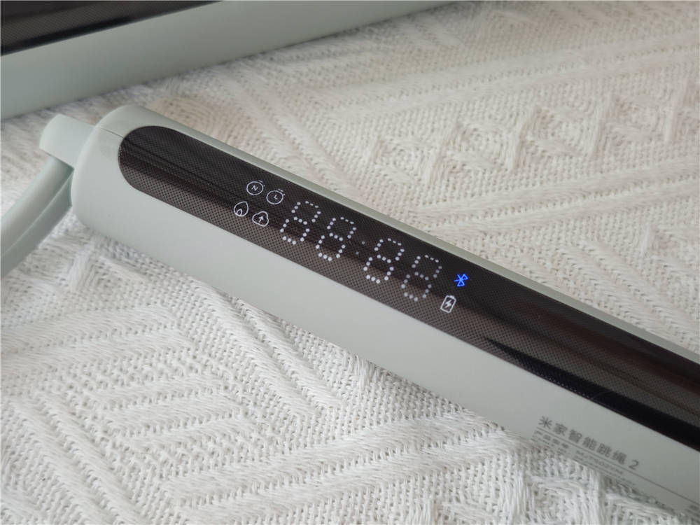 椭圆形点阵数显屏幕,搭配深色跑道设计,让数字显示区域更突出,屏幕可以显示:跳绳个数、训练时长、卡路里消耗、硬件升级、蓝牙状态和电量情况。
