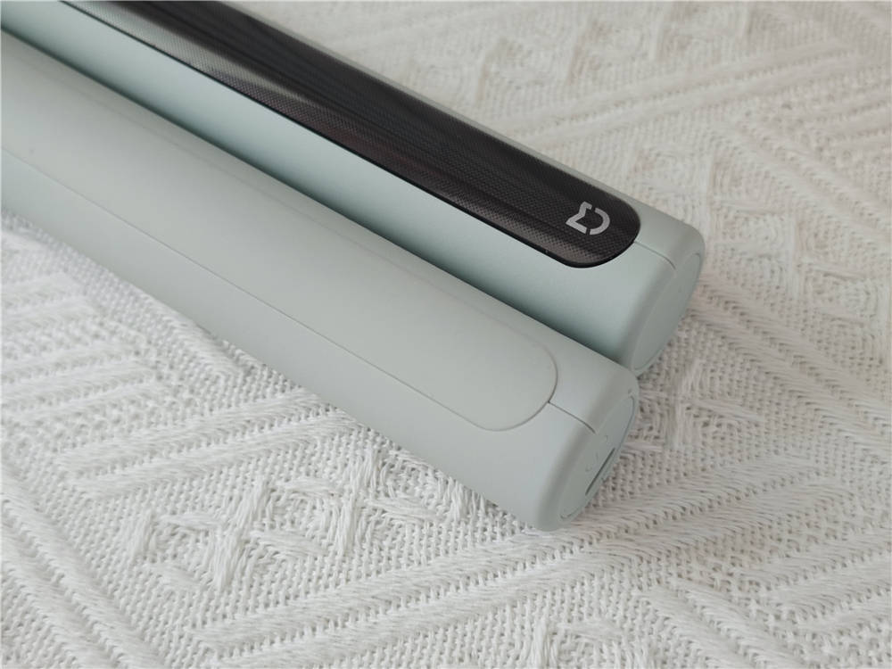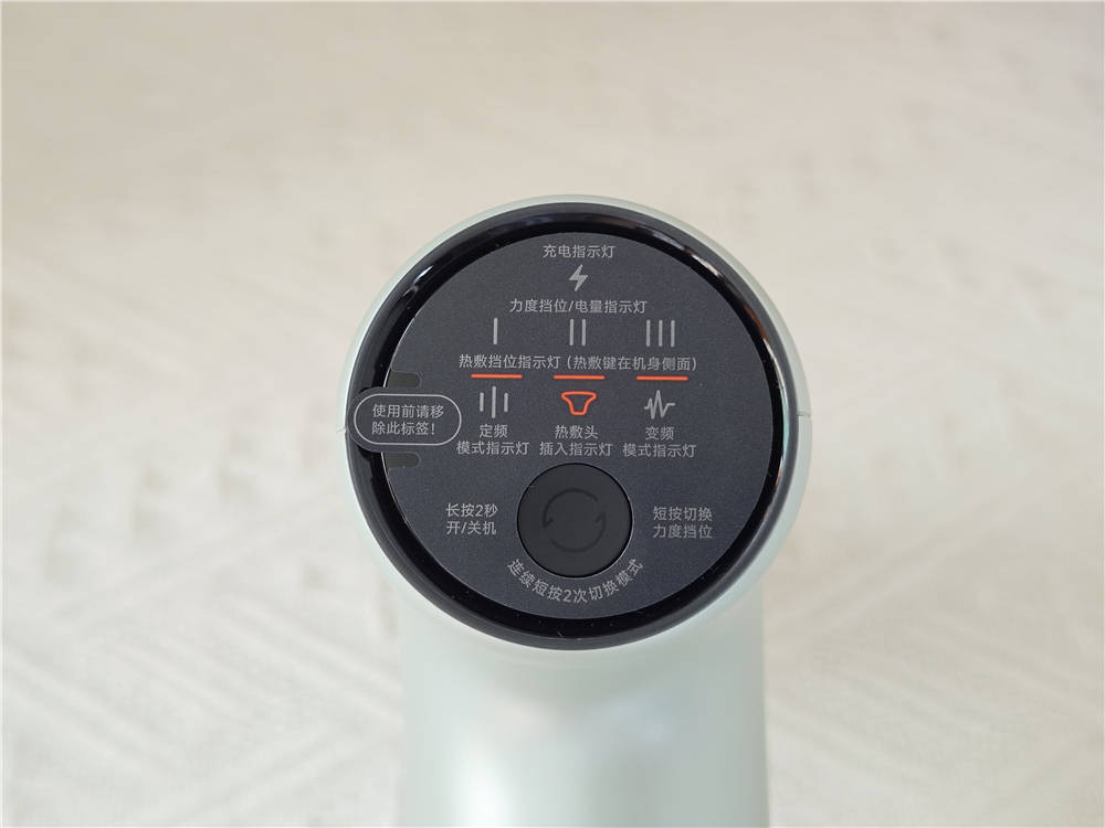 米家热敷筋膜枪H3迷你版手柄背面采用一体化LED指控面板,LED显示面板有:充电指示灯、力度挡位/电量指示灯,热敷挡位指示灯、定频模式指示灯、热敷头插入指示灯、变频模式指示灯,外围一圈为力度指示灯环,用户可以根据灯环状态,判断力度。下方底部有一颗功能键,长按功能键2秒开/关机键开机,短按切换挡位,一键操作更快捷。