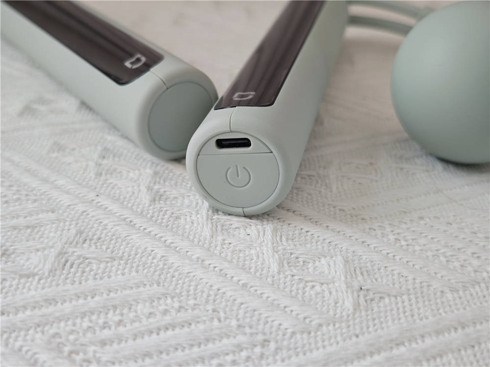 手柄底部有电源键和Type-C充电接口,内置200mAh锂电池,充满后每天跳绳运动30分钟可使用20天。长按电源键2秒以上实现开关机,短按电源键,循环切换跳绳个数、训练时长、卡路里消耗显示。连续短按两次电源键,显示清零,即可开始新的训练。