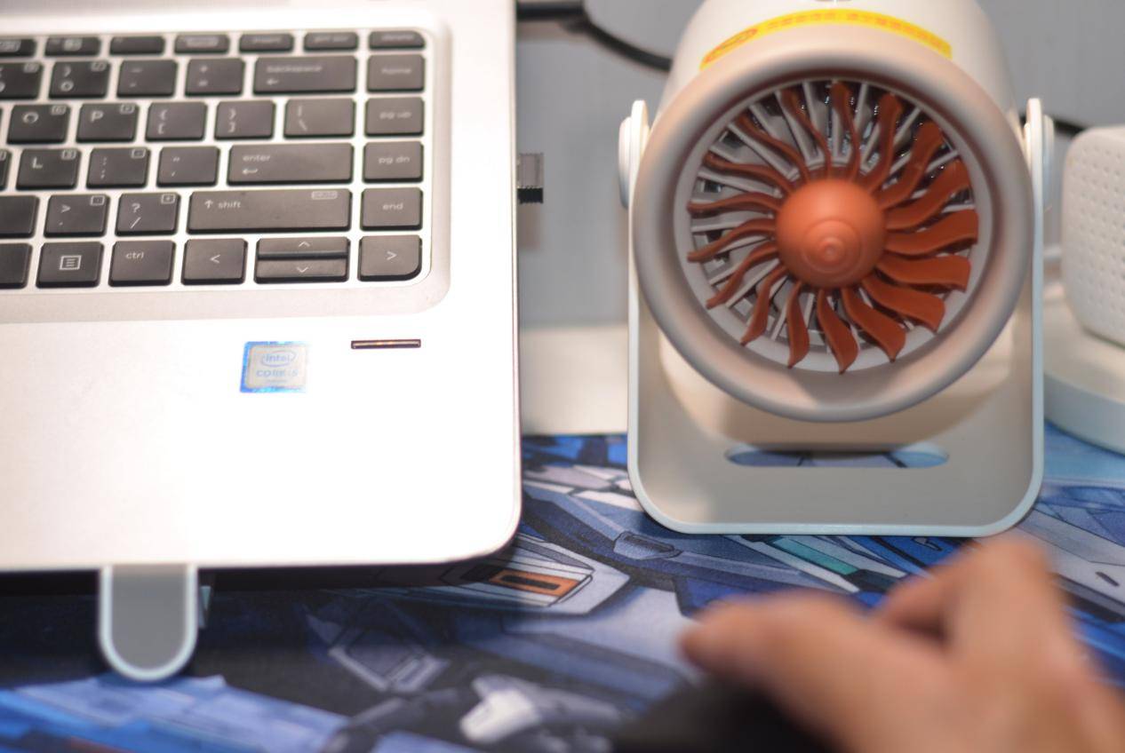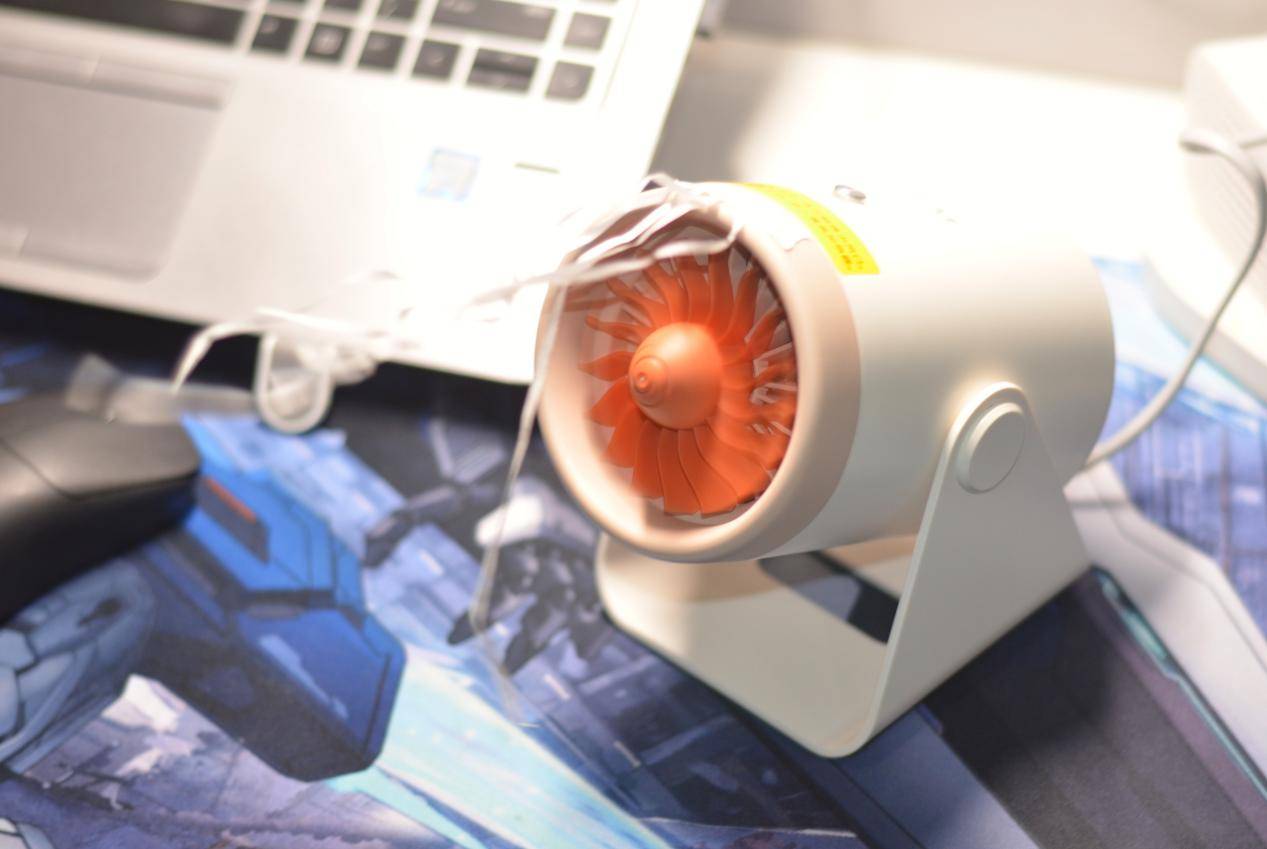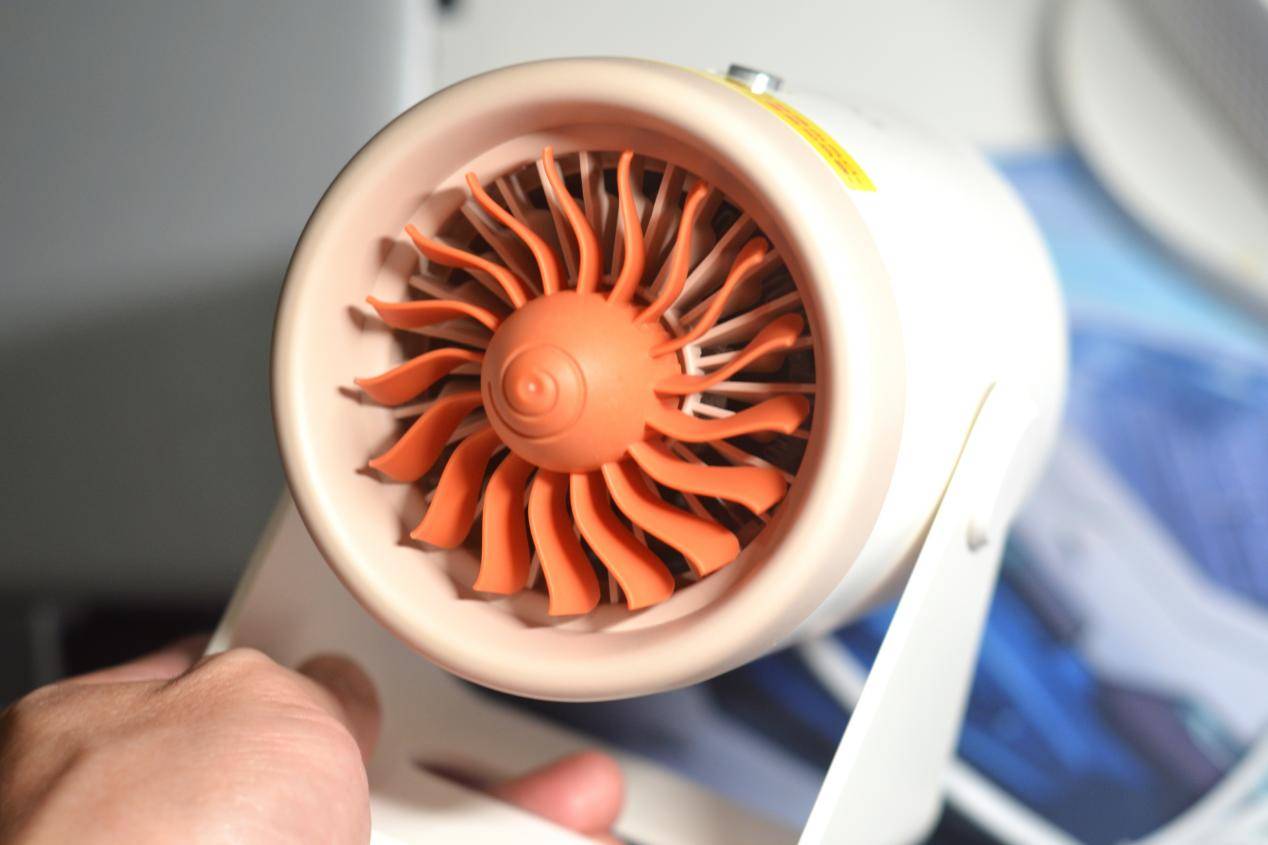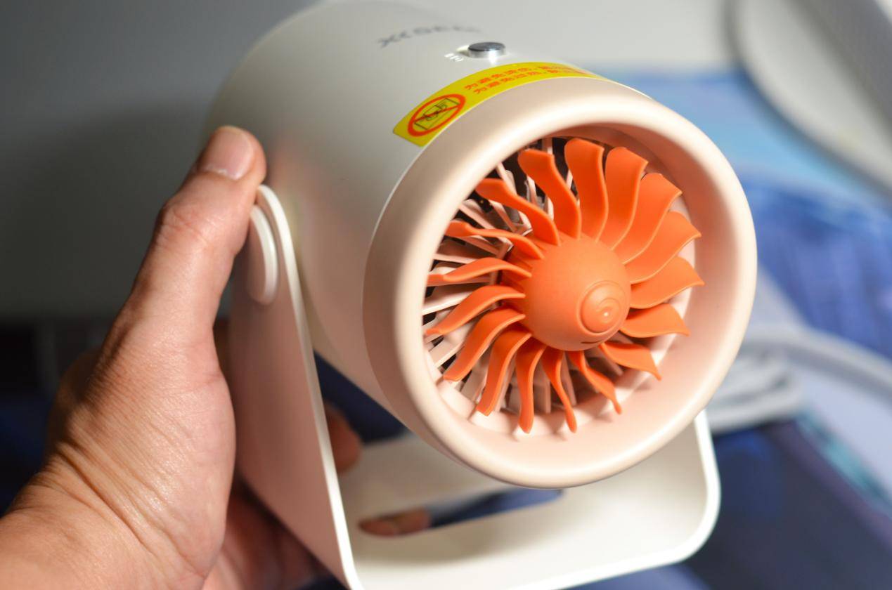 西圣Warm Mini暖风机182克超轻量化,拿在手上很轻巧,橙色的扇叶搭配暖风机白色突显特色,转动起来像飞机涡轮发动机一样。