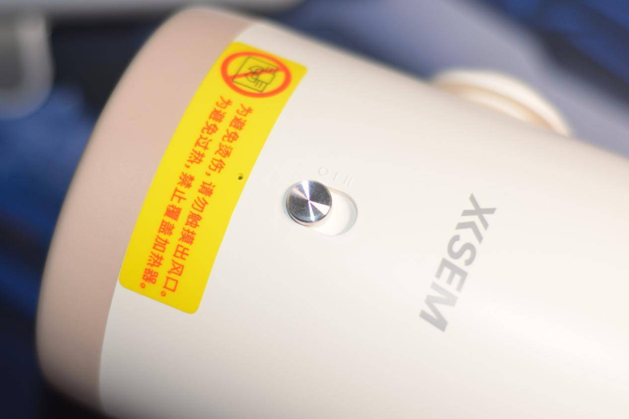 开关位于暖风机上方,采用关机、一档、二挡三节式拨动开关,前方贴有警示提醒:避免烫伤和禁止覆盖,两个档位热量调节,适用于不同程度天气温度,使用者可以根据需要的温度调节档位。
