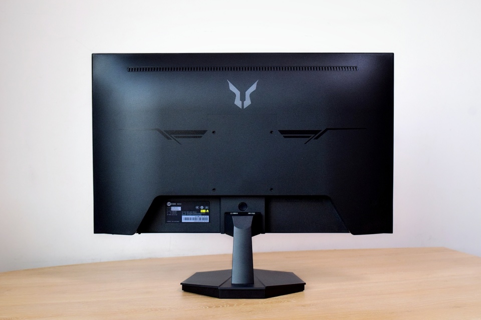 机身背面设计很简约,中间靠上的位置是银色的来酷品牌logo,两侧的亮漆装饰让整机多了一丝游戏氛围感。另外背面还预留了VESA标准壁挂孔,能够满足用户对显示器的壁挂需求。