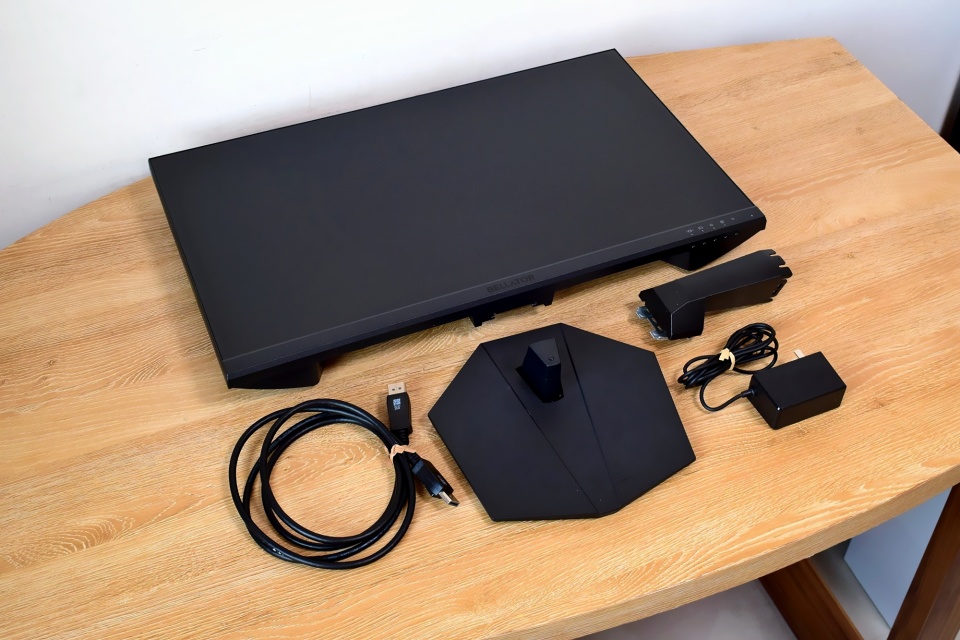 盒中的物品比较简单,除了显示器主机,还有底座、支架、DP高清线和电源线。和其他电竞屏不同,联想来酷N24采用了外置电源适配器,这个设计还是并不常见的。