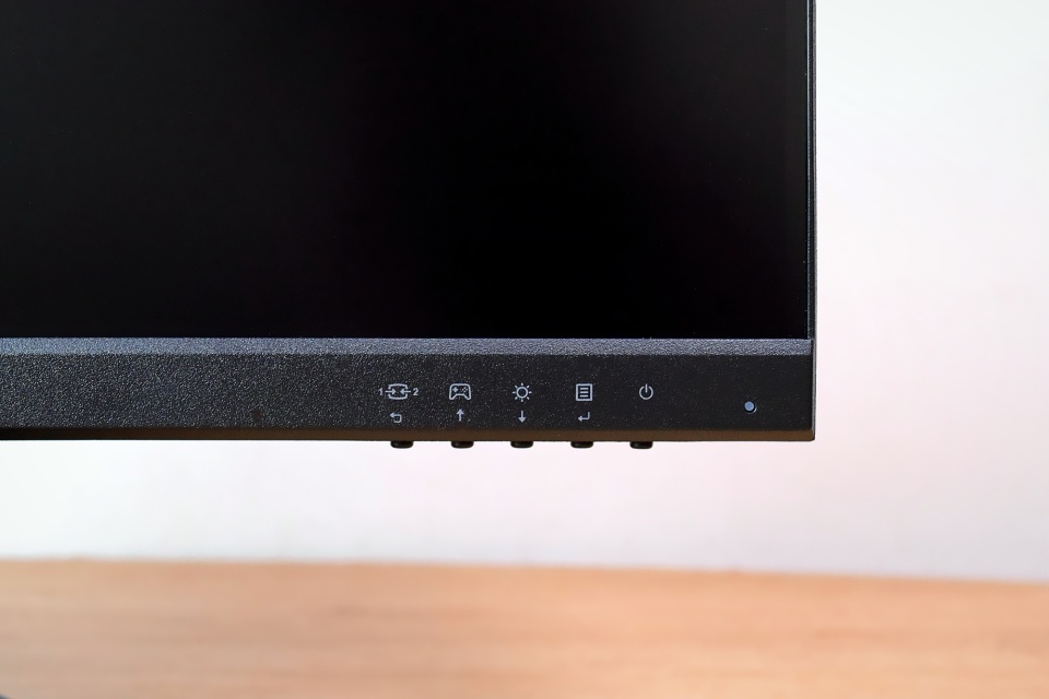 显示器的按键在屏幕右侧下方位置,从左到右依次为信号源切换键(返回)、游戏模式(上键)、亮度设置(下键)、菜单键(确认)和电源键,按键设计简洁、标注清晰,更加方便用户快速上手。另外电源键右侧还有个指示灯,可以让用户实时了解显示器的当前状态。