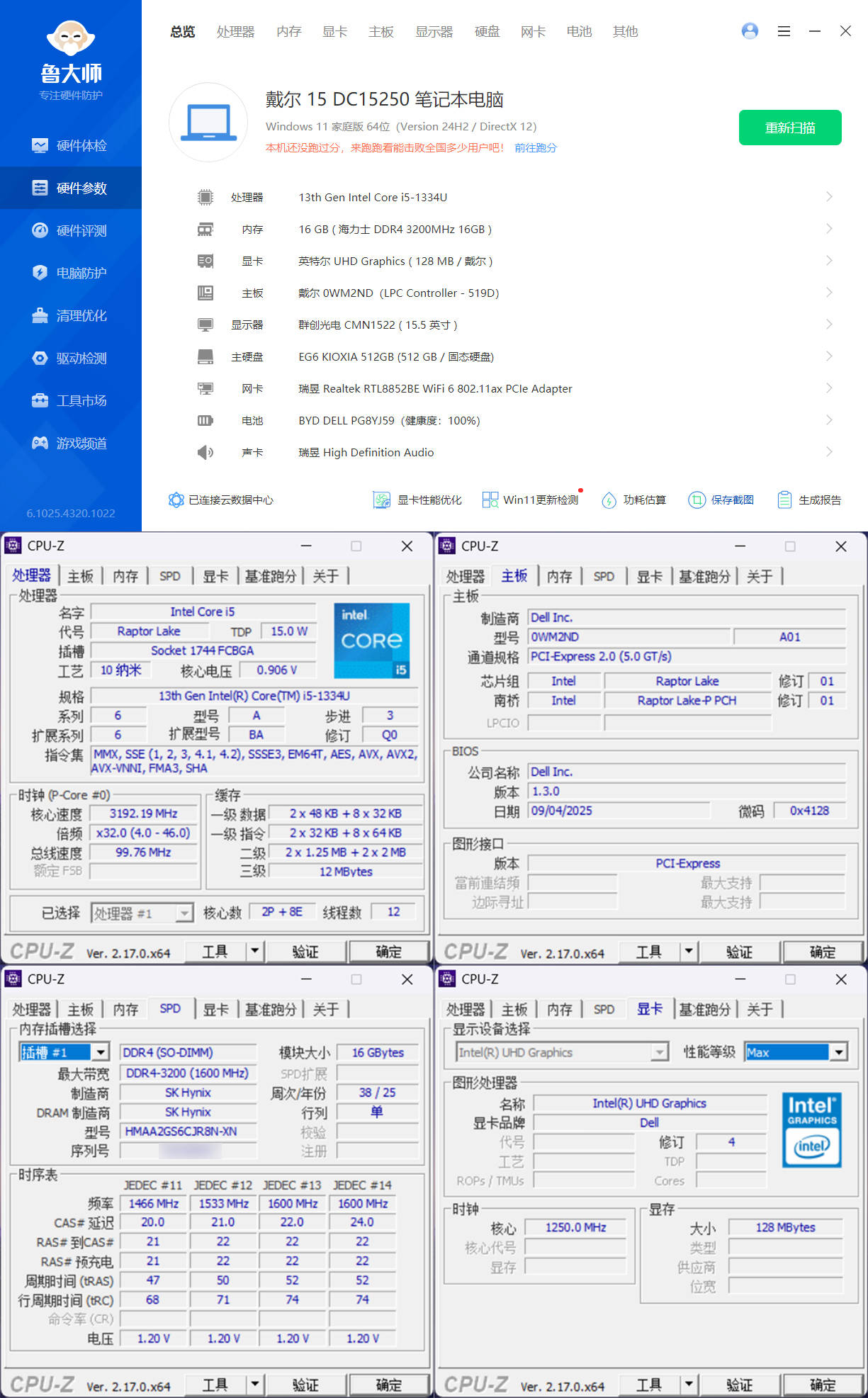 ▼我手里这台戴尔15 DC15250的基本配置如下,CPU为十三代酷睿i5-1334U,十核十二线,其中2个性能核8个能效核,性能核最大睿频4.6Ghz,能效核最大睿频3.4Ghz,多任务处理完全不在话下;内置了一根16G的海力士DDR4 3200Mhz内存条(但是运行在2666Mhz),最高可以扩展到32G,硬盘为512G的铠侠EG6,是一款PCIe4.0的NVMe固态硬盘,读写性能比较强,开机快,文件复制拷贝速度快;这套配置在这个价位的轻薄本里还算可以,够用