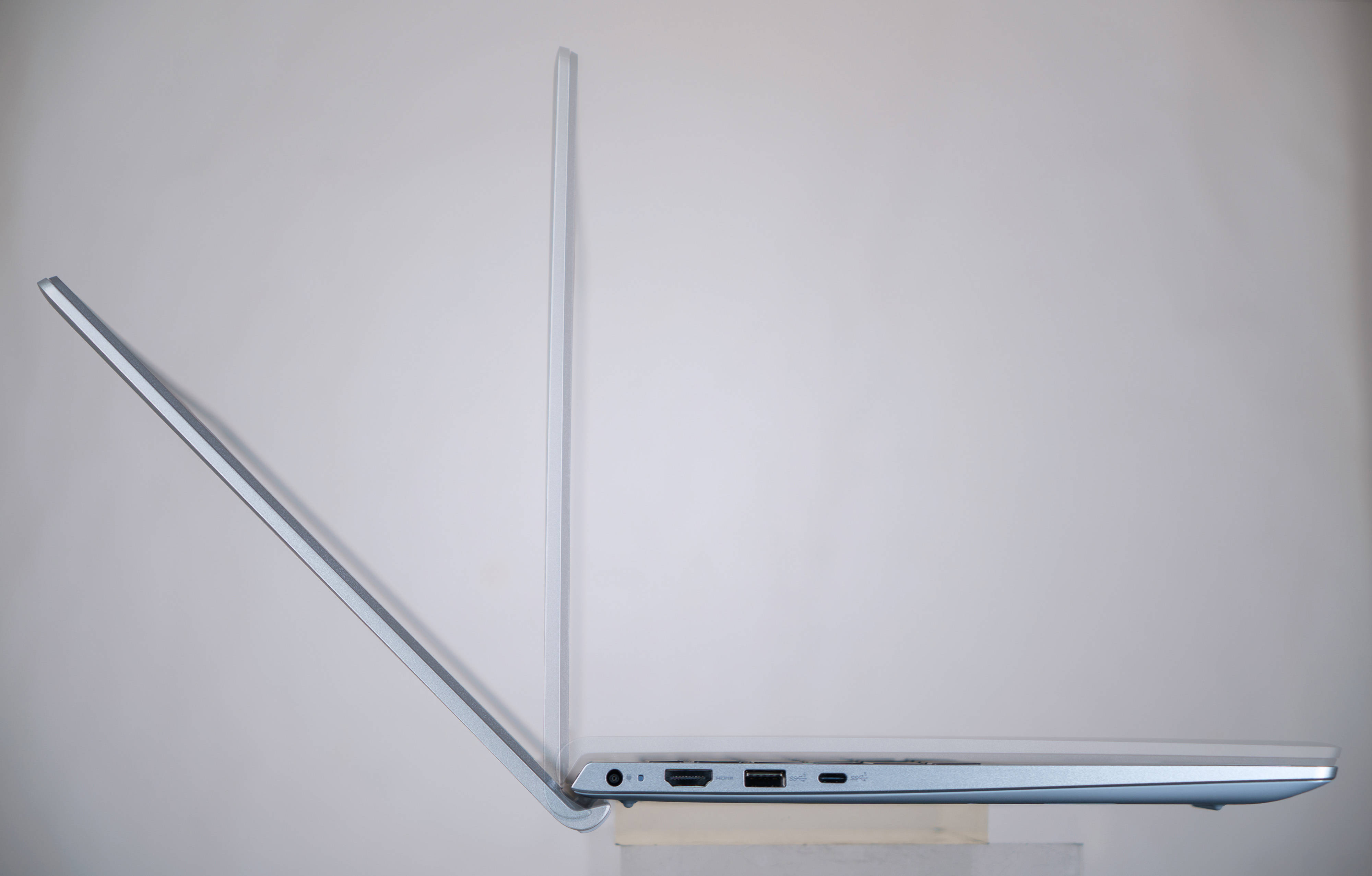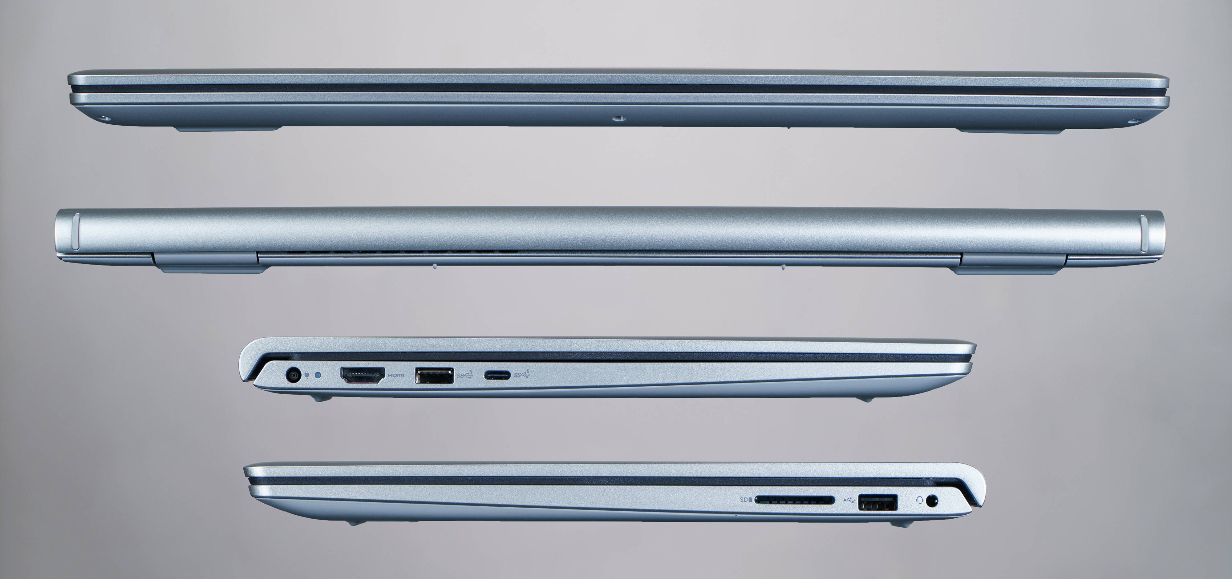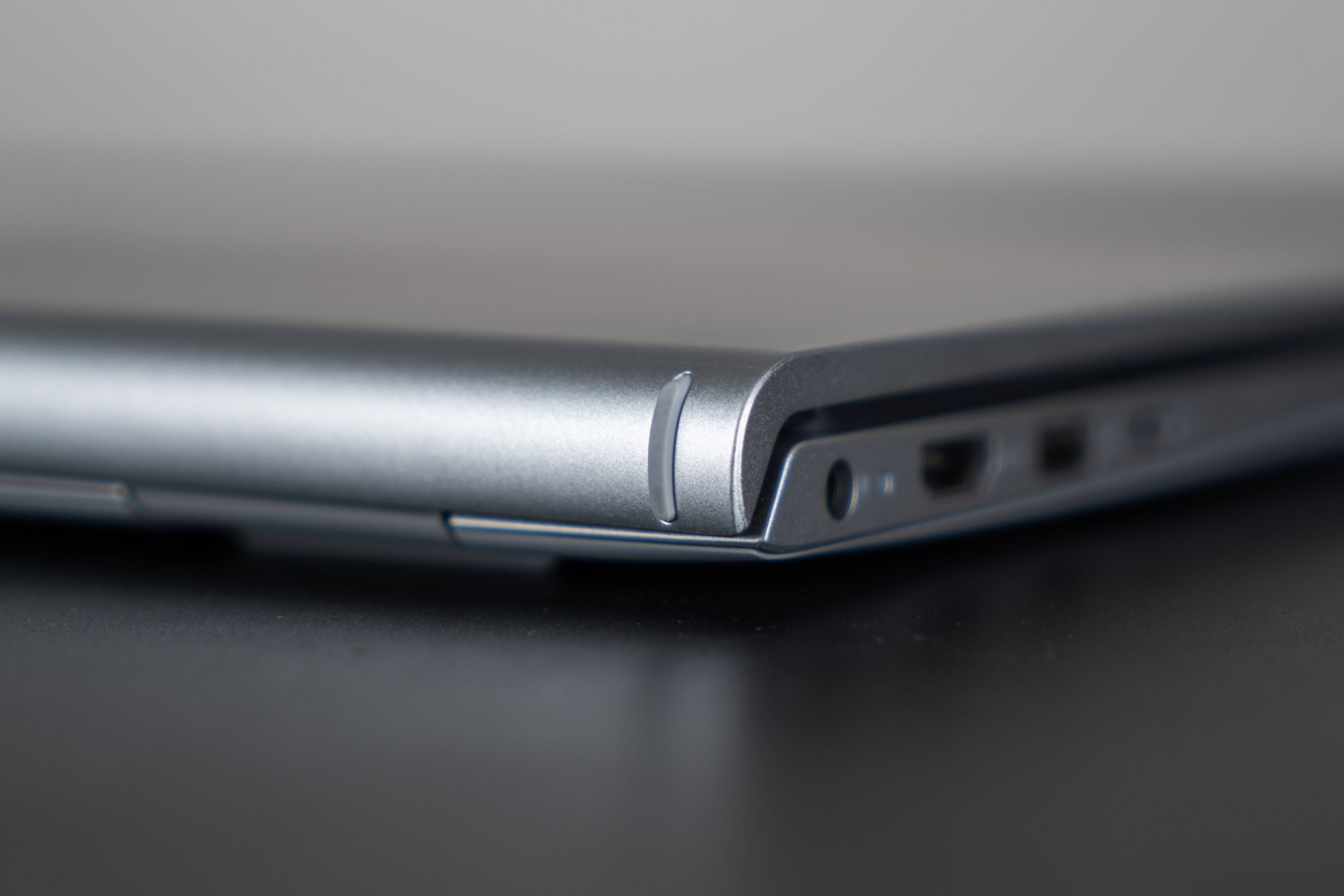 ▼哪怕合起来,侧面看起来依旧很薄;左侧面有一个DC供电接口、一直电源指示灯、一个全尺寸HDMI输出接口、一个USB3.2接口、一个type-c接口,右侧面有一个非常先进的3.5mm音频输出接口、一个USB2.0接口、一个SD卡槽,一般情况下这些接口足够用了;如果你的耳机是type-c接口的,插在它的C口也是能直接使用,兼容性非常不错;目前超薄本里能搭载全尺寸HDMI接口的产品比较少,虽然现在大多数都是C口直接投屏,但是HDMI相对来说还是更加常见、通用一些;可惜没有RJ45网口,如果想要连接有线就必须用外置的USB网卡