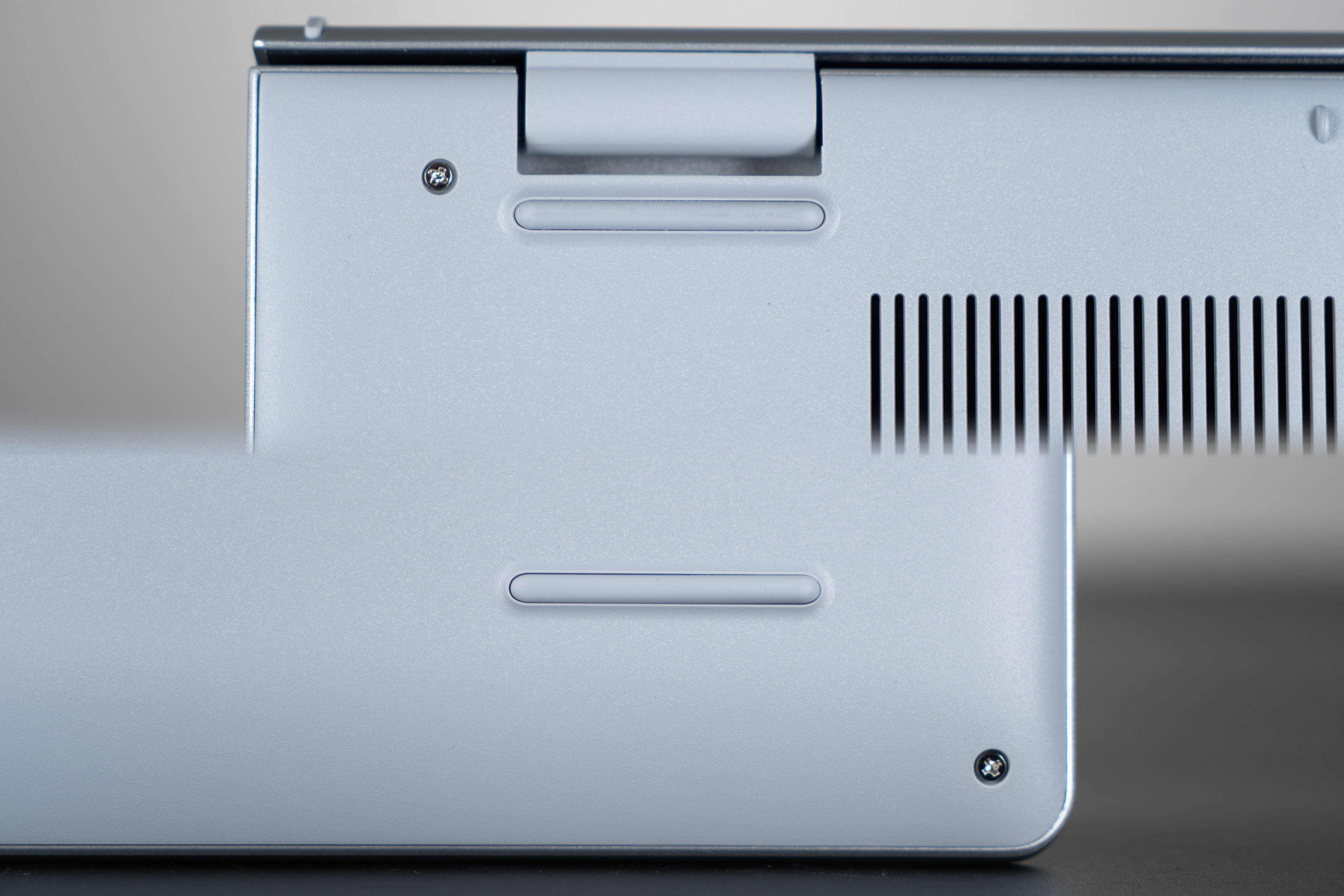 ▼D面靠近转轴处是散热进风口开孔,开在这个位置的好处就是只需要把电脑垫起一头就能提高散热空间,有很多笔记本进风口开在正中间,必须得整体垫高才行,就很尴尬;四个角落还有长条形橡胶脚垫,放在光滑的桌面上不易位移