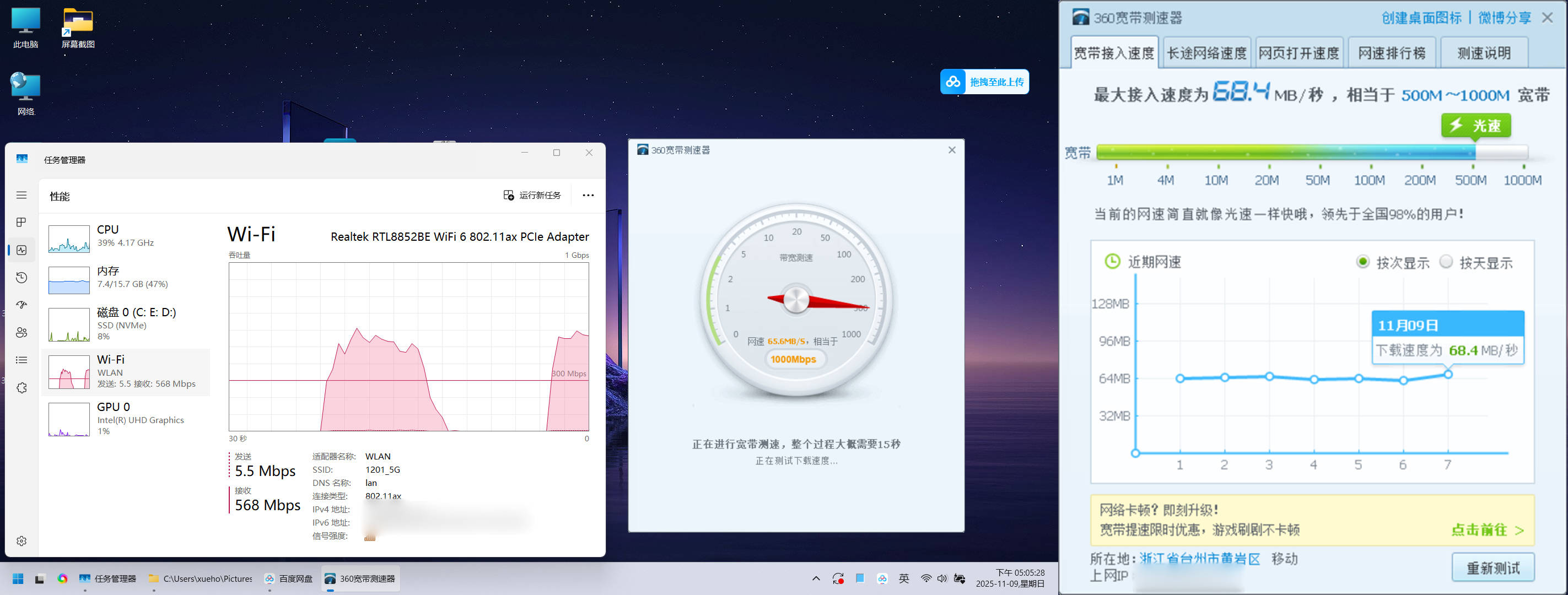 ▼娱乐大师和CPU-Z的跑分如下,显卡毕竟是核显,稍微有点点拖后腿,其他方面的性能是够用的,WiFi6的无线网卡在千兆宽带下的速度表现也在下面了,但毕竟是一台轻薄本,不能要求太高的