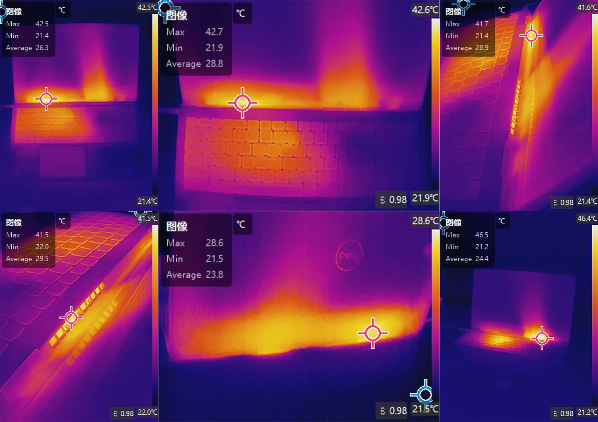 ▼在跑分的时候我顺便拍下了热成像图,可以看到C面主要发热的位置在键盘左上角,42.5℃左右,还行,而下半部分掌托和触控板位置温度比较低,打字时候的手腕处不会感觉烫,散热出风口是对着屏幕吹的,虽然不知道对屏幕局部烤着会不会有影响,但是苹果笔记本也是这种设计,应该没啥问题