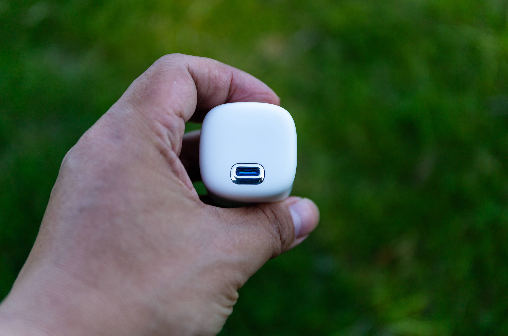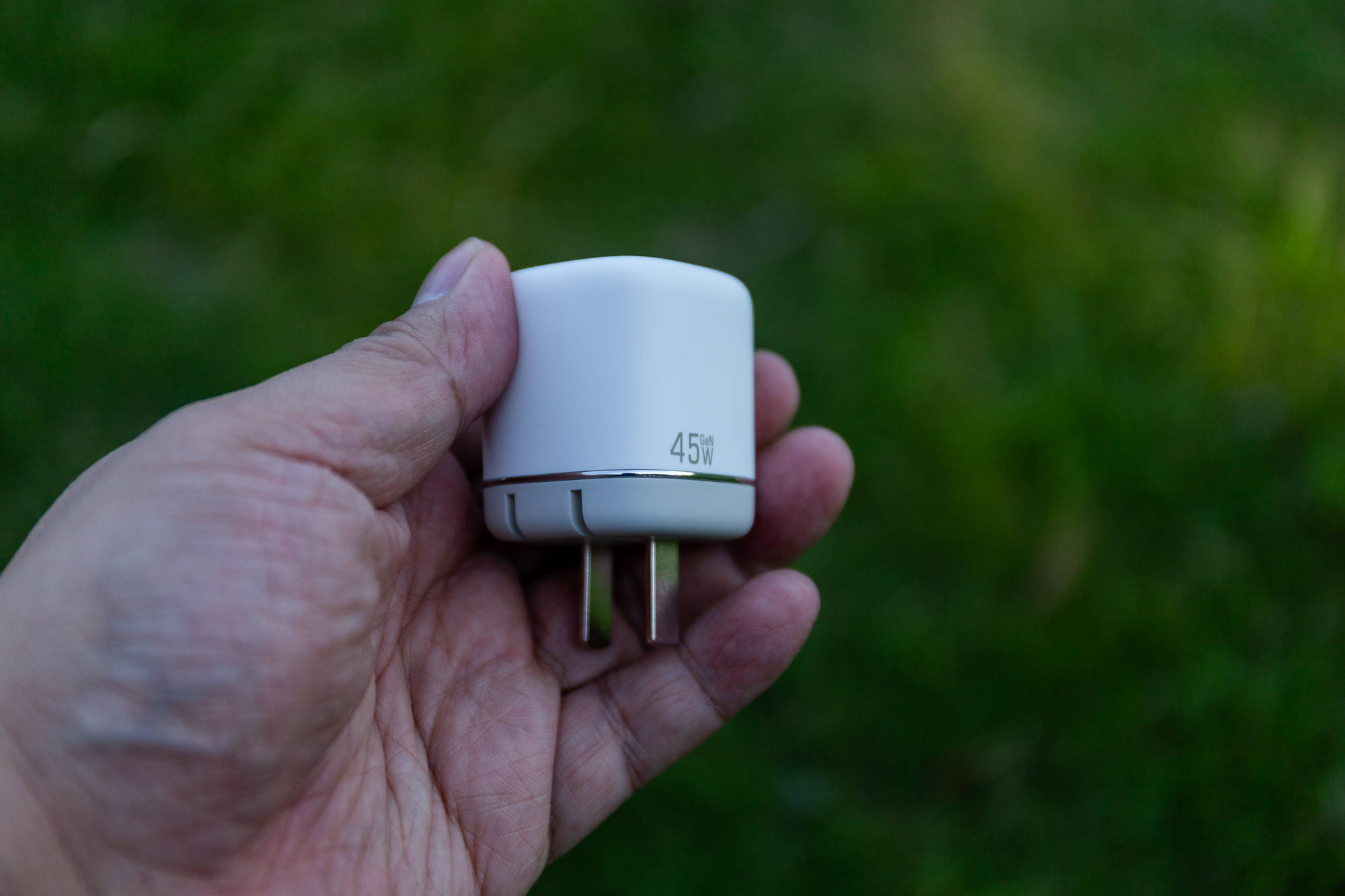 航嘉灵动F45 Turbo氮化镓充电器的外观设计独具匠心,圆角形设计,搭配银白色金属光泽点缀,以及莫兰迪色系的配色,让这个产品颇具时尚气息,像极了一个艺术品。充电器的插销,可以折叠,进一步减小产品占据的空间,让其更加小巧便携,即使对于需要携带化妆品的女士,也不会增加任何负担,可以轻松放入小巧的手提包中。
