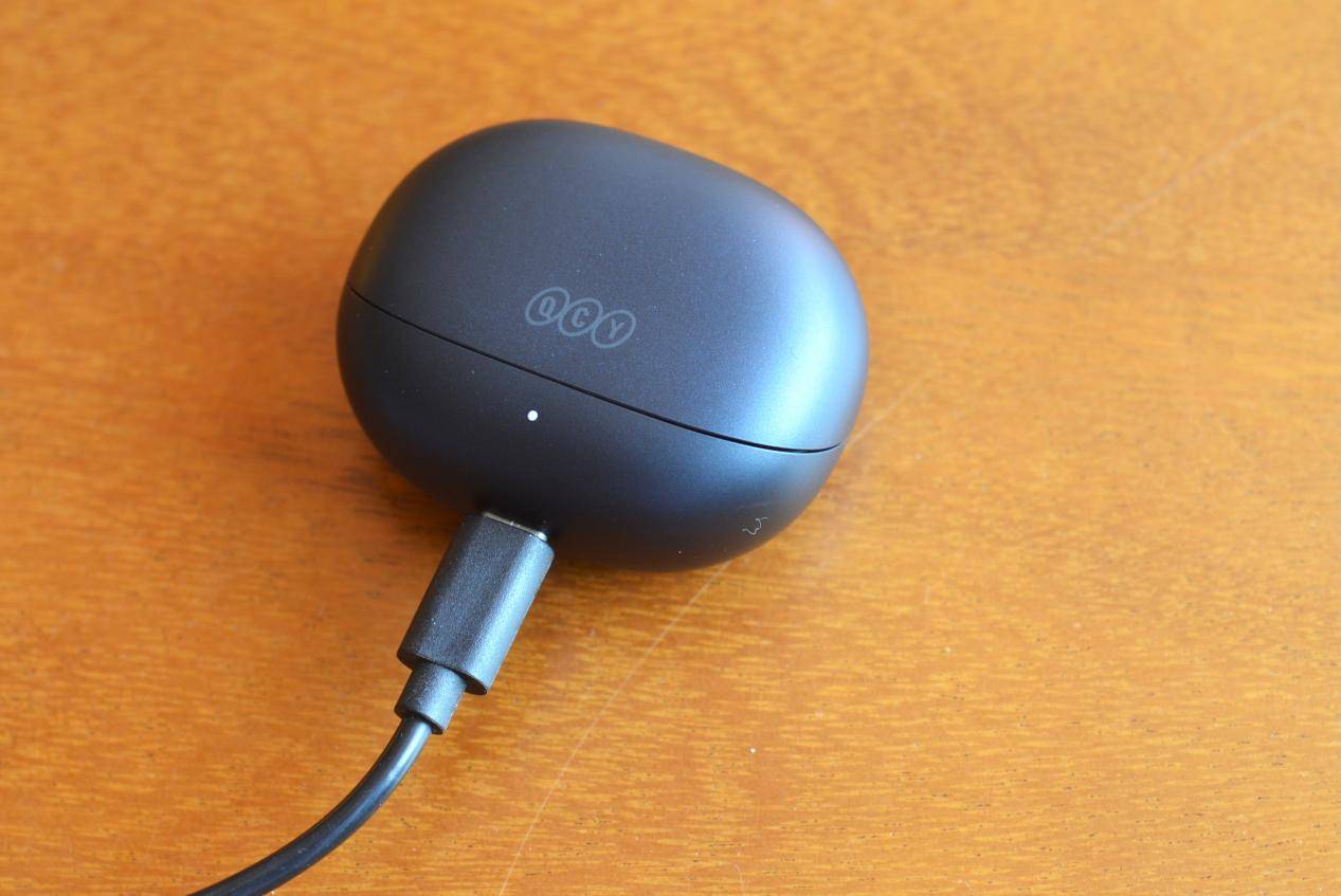 QCY N20共推出花语紫、午夜黑、皓月白三款配色,我选择的是午夜黑色款,充电仓采用鹅卵石圆型设计,磨砂材质防滑还不易沾染指纹,整体精致小巧便携,充电仓正面有品牌LOGO,下方为电量指示灯。