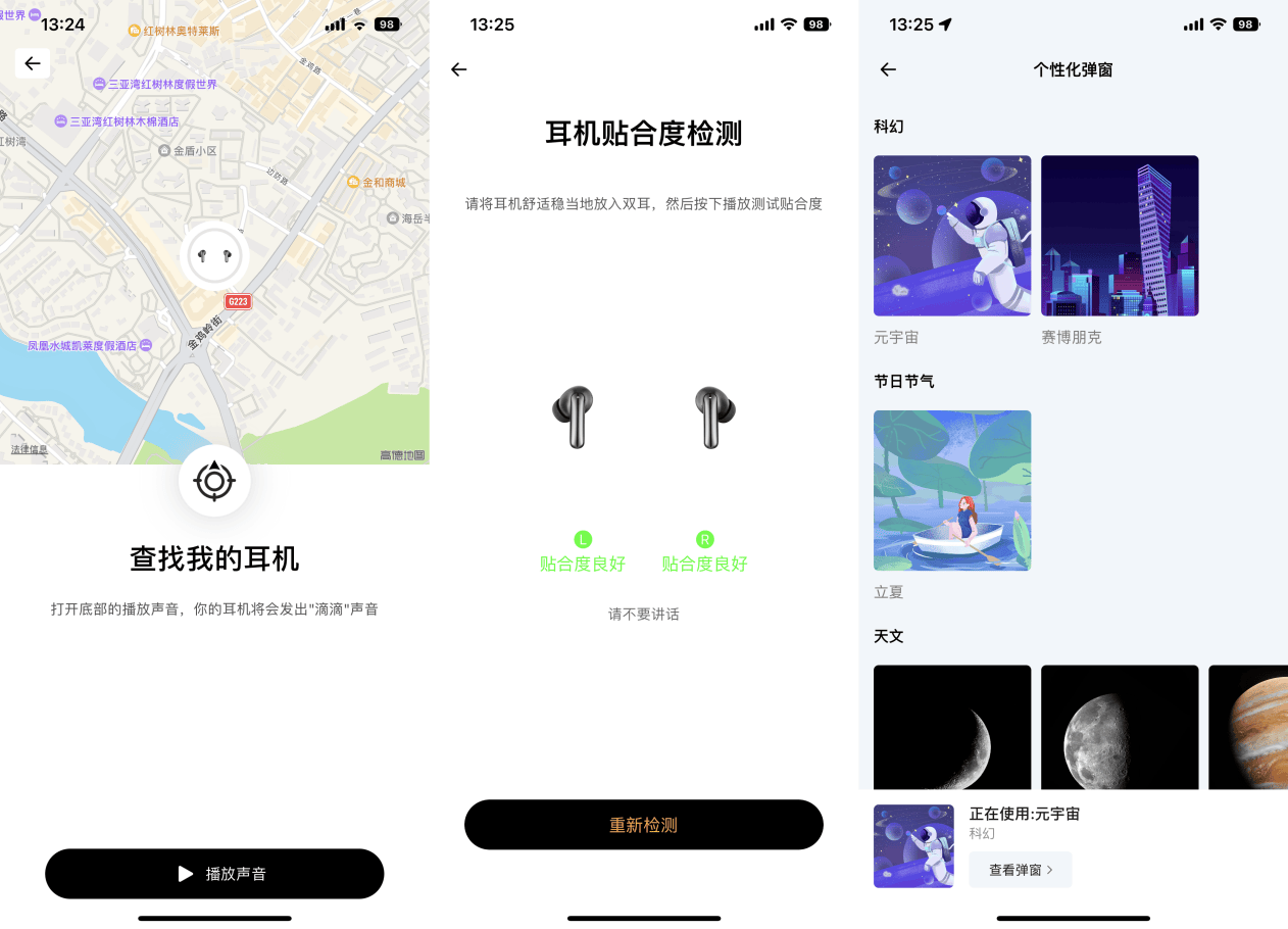 实际上我更喜欢APP内的查找耳机、监测耳机贴合度和个性化弹窗,很多时候不知道耳机放在什么地方,通过APP就可以播放声音快速找到,对于耳机佩戴贴合度非常好,可以让佩戴更舒适,聆听的音效也更佳,个性弹窗可以根据个人喜好的添加。