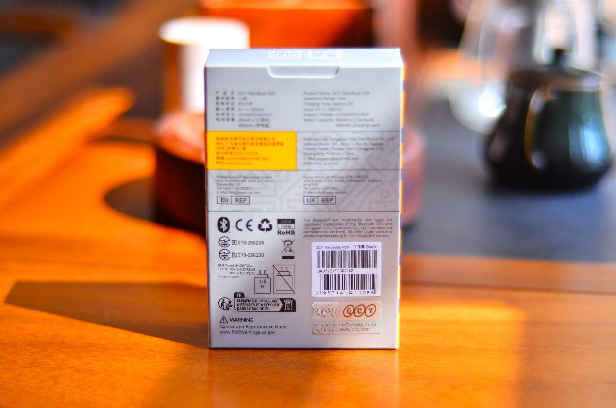 QCY N20秉承QCY耳机的一贯外包装,正面有QCY品牌LOGO和耳机示意图,并附有“Be Creative,Go Beyond.”(“去创意・去超越“)的品牌导向,背面有该款耳机各项参数和制造商信息。